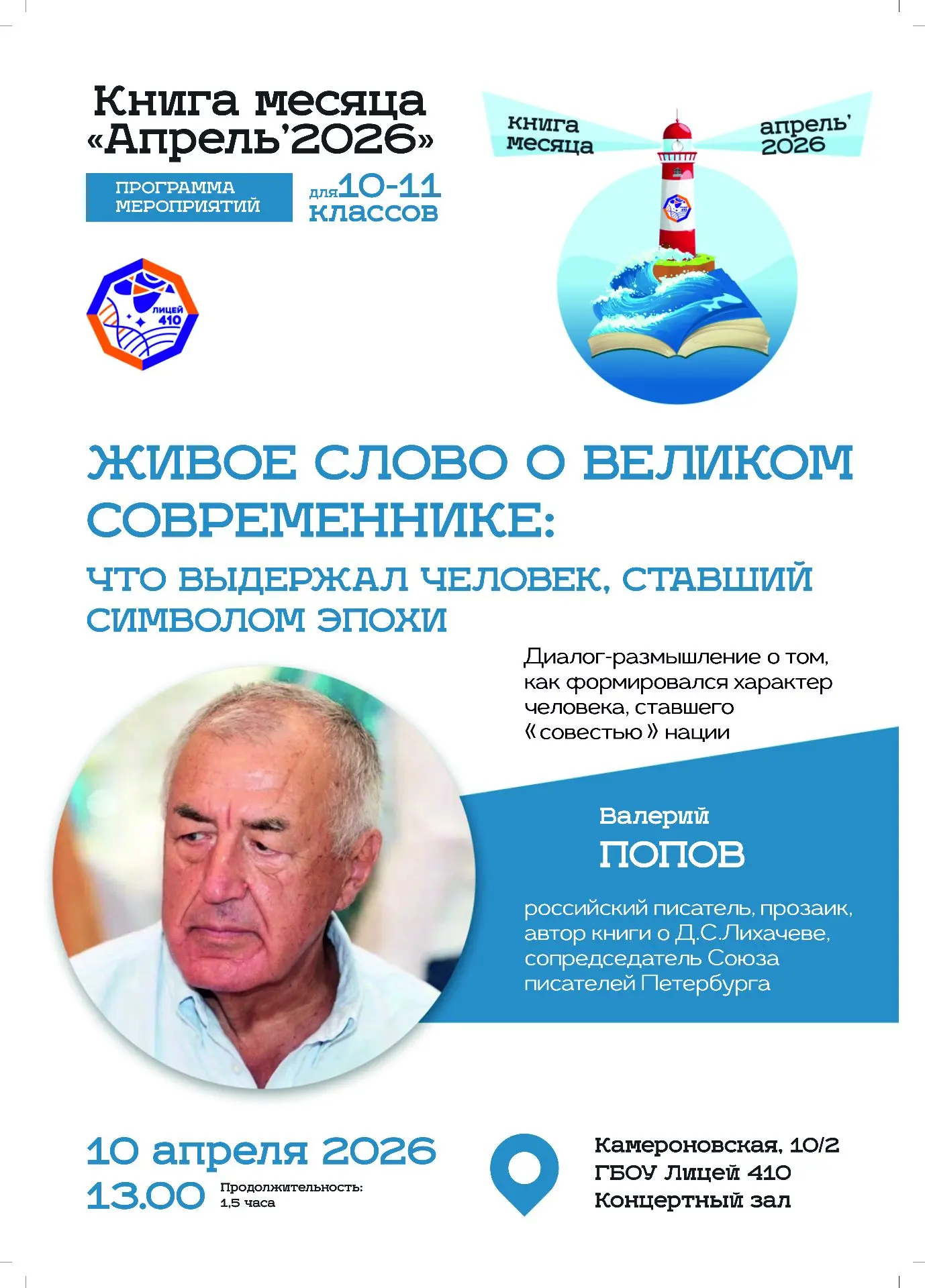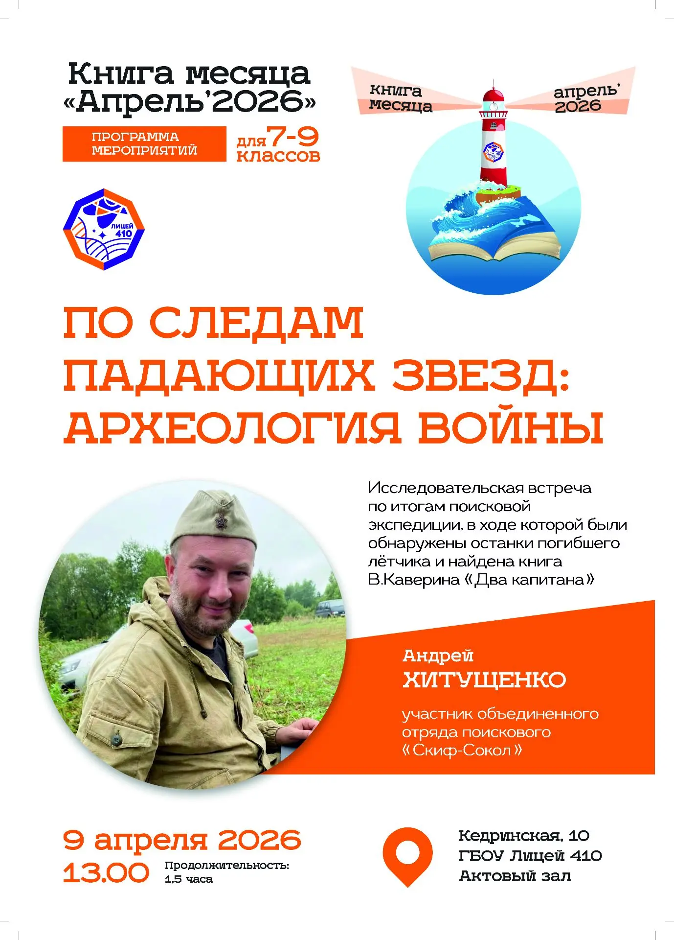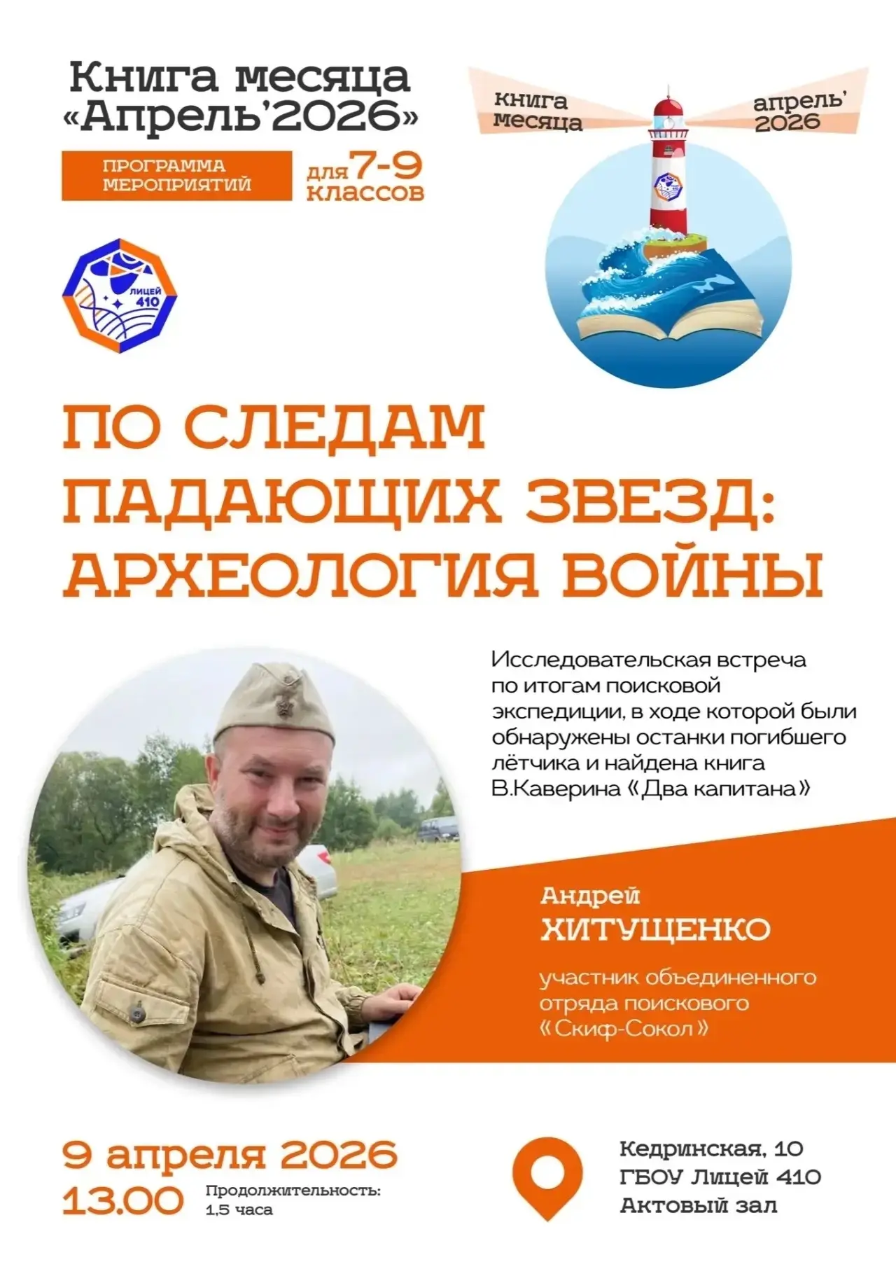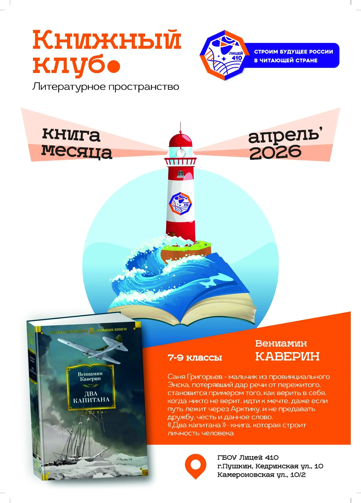 Приглашаем учеников 8-9 классов 15 апреля в 13:00 на уникальное мероприятие, посвящённое роману Вениамина Каверина «Два капитана».