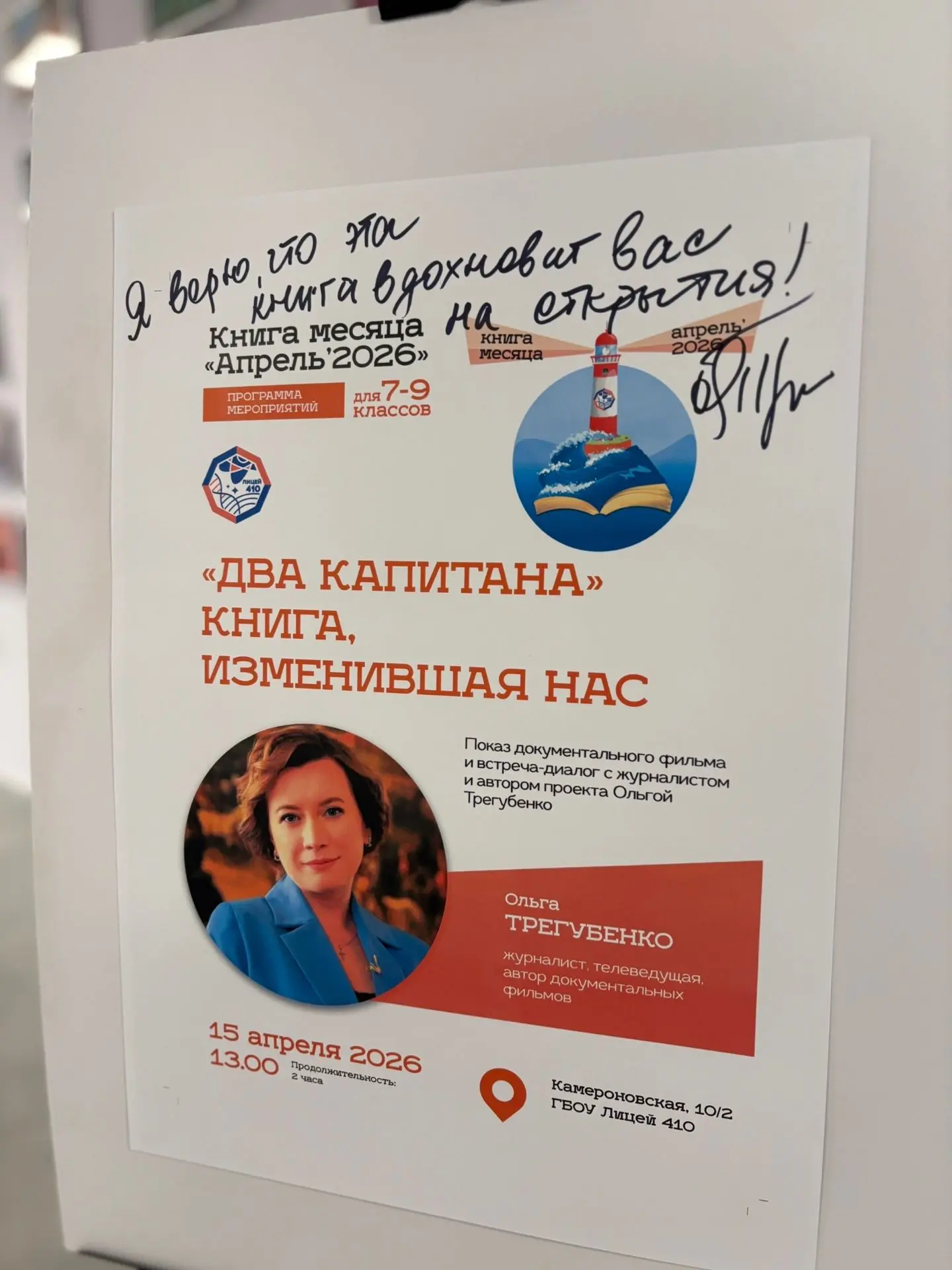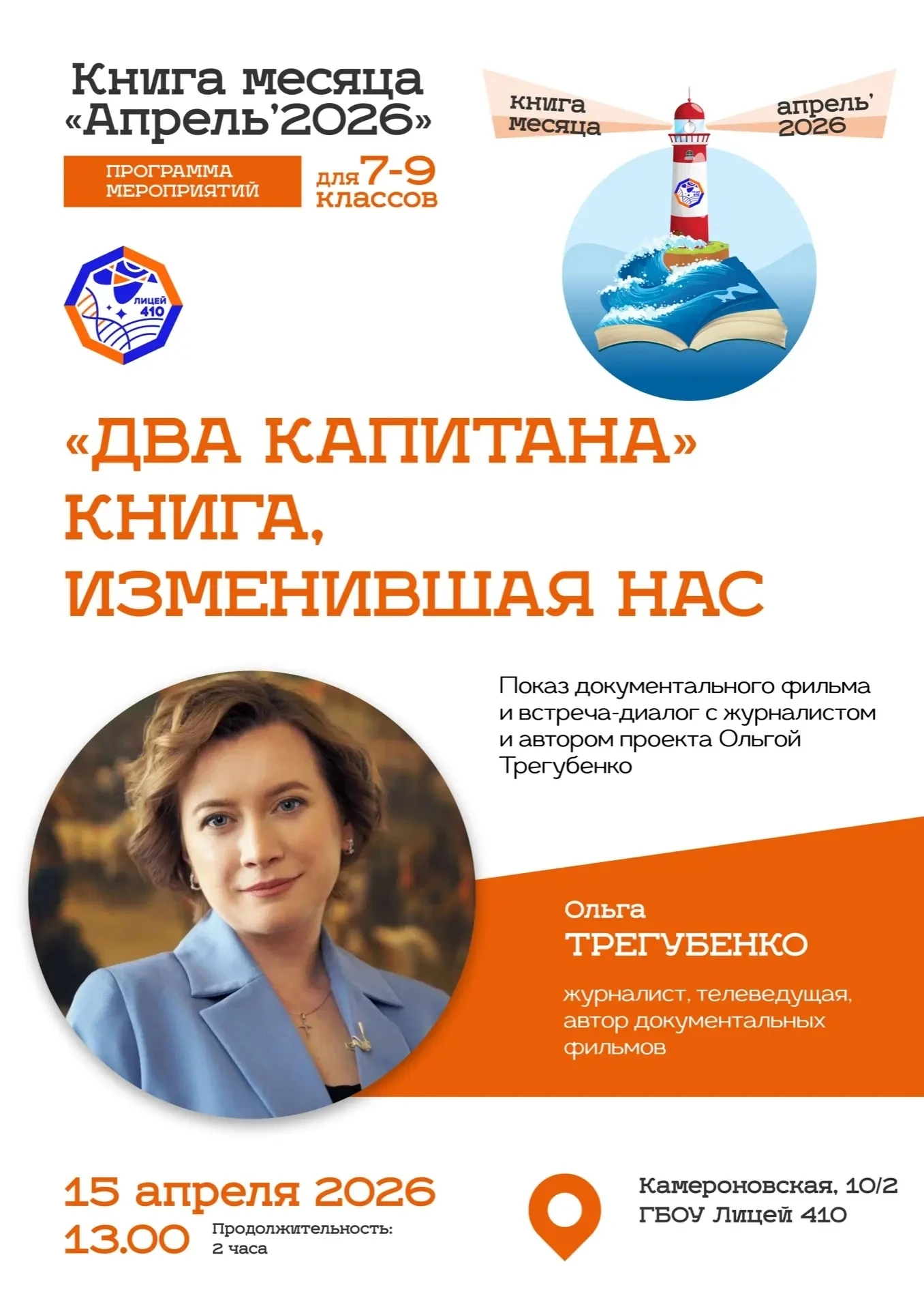Вчера в лицее состоялось уникальное событие - встреча с режиссером и автором документального фильма «Книга, изменившая нас. Два капитана» Ольгой Трегубенко. Мероприятие стало частью глубокого погружения в мир знаменитого романа Вениамина Каверина, который уже почти столетие вдохновляет читателей на подвиги и верность своей мечте. И эта встреча стала уже второй встречей, посвященной изучению знаменитого романа в мире (а не только в России) «Два капитана» и лицейского проекта «Книга месяца».