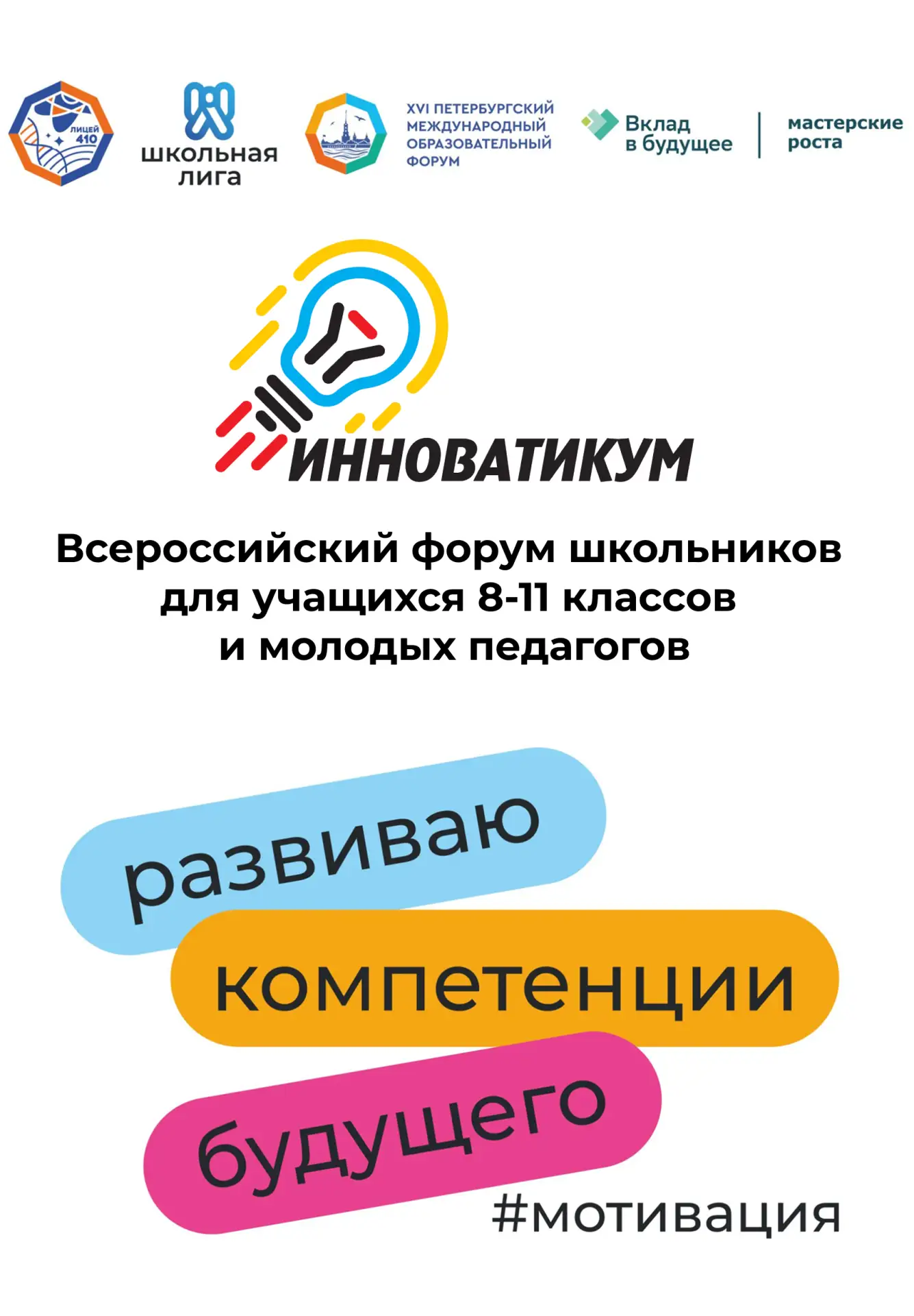 31 марта на площадке нового корпуса «Камероновский» лицея № 410 Пушкинского района Санкт‑Петербурга состоится Всероссийский форум школьников для учащихся 8-11 классов и молодых педагогов "Инноватикум".
