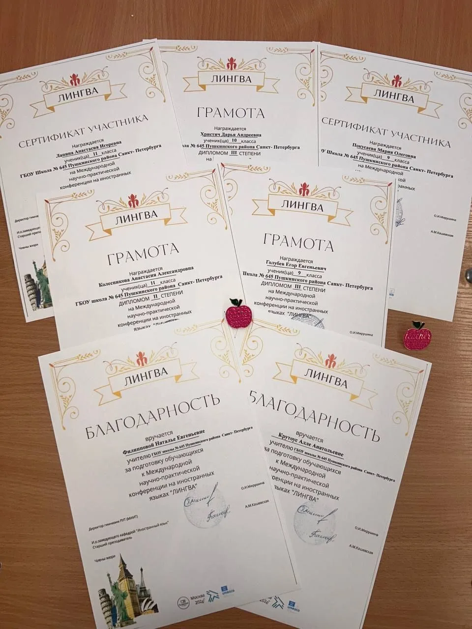 с проектом: «Мосты Лондона и Санкт-Петербурга точки соприкосновения» ( «Bridges of London and Saint Petersburg, similarities»), ученица 9 «А» класса; Христич Дарья с проектом «Изучение английского языка с помощью просмотра фильмов и сериалов» («Learning English through watching movies and series»), ученица 10 «В» класса; Лапина Анастасия с проектом «Роль идиом в книге "Гарри Поттер и философский камень" Д.К. Роулинг»