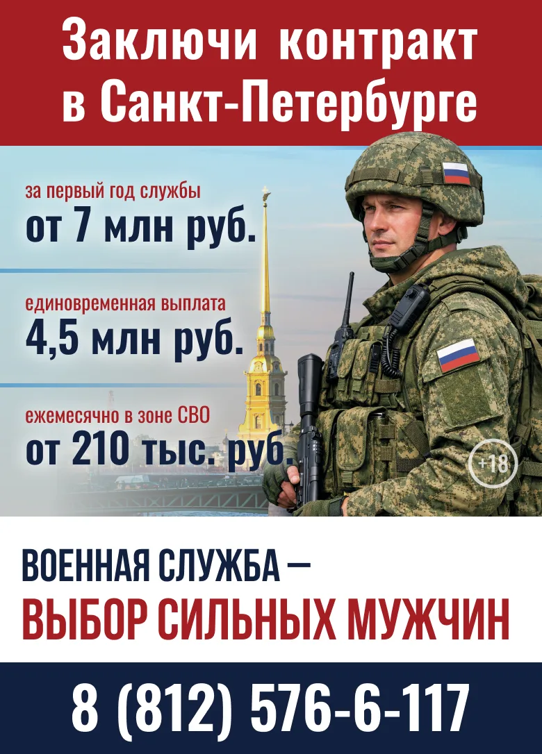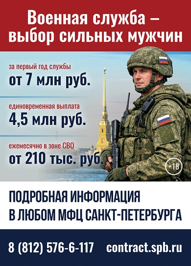В Санкт‑Петербурге созданы все условия для заключения контракта на военную службу в Вооруженных Силах Российской Федерации. Размер выплаты в Санкт-Петербурге составит от 5,5 млн рублей в год, из них 3 млн рублей выплатят сразу после заключения контракта.