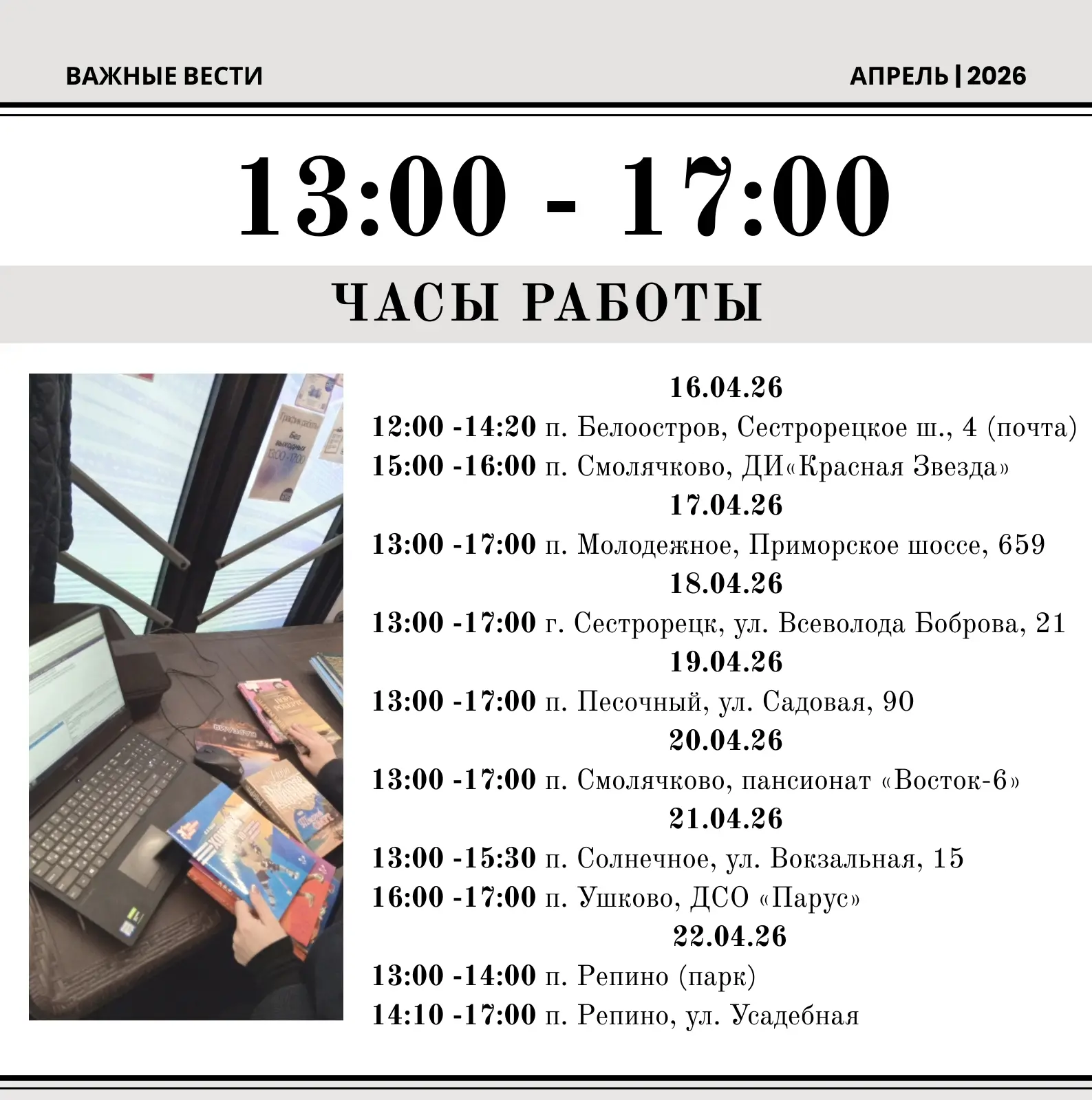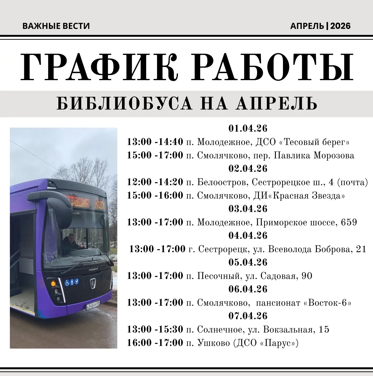 7⃣ и 2⃣1⃣ апреля с 13:00 до 15:30 у здания муниципального совета по адресу: п Солнечное, Вокзальная улица, дом 15.