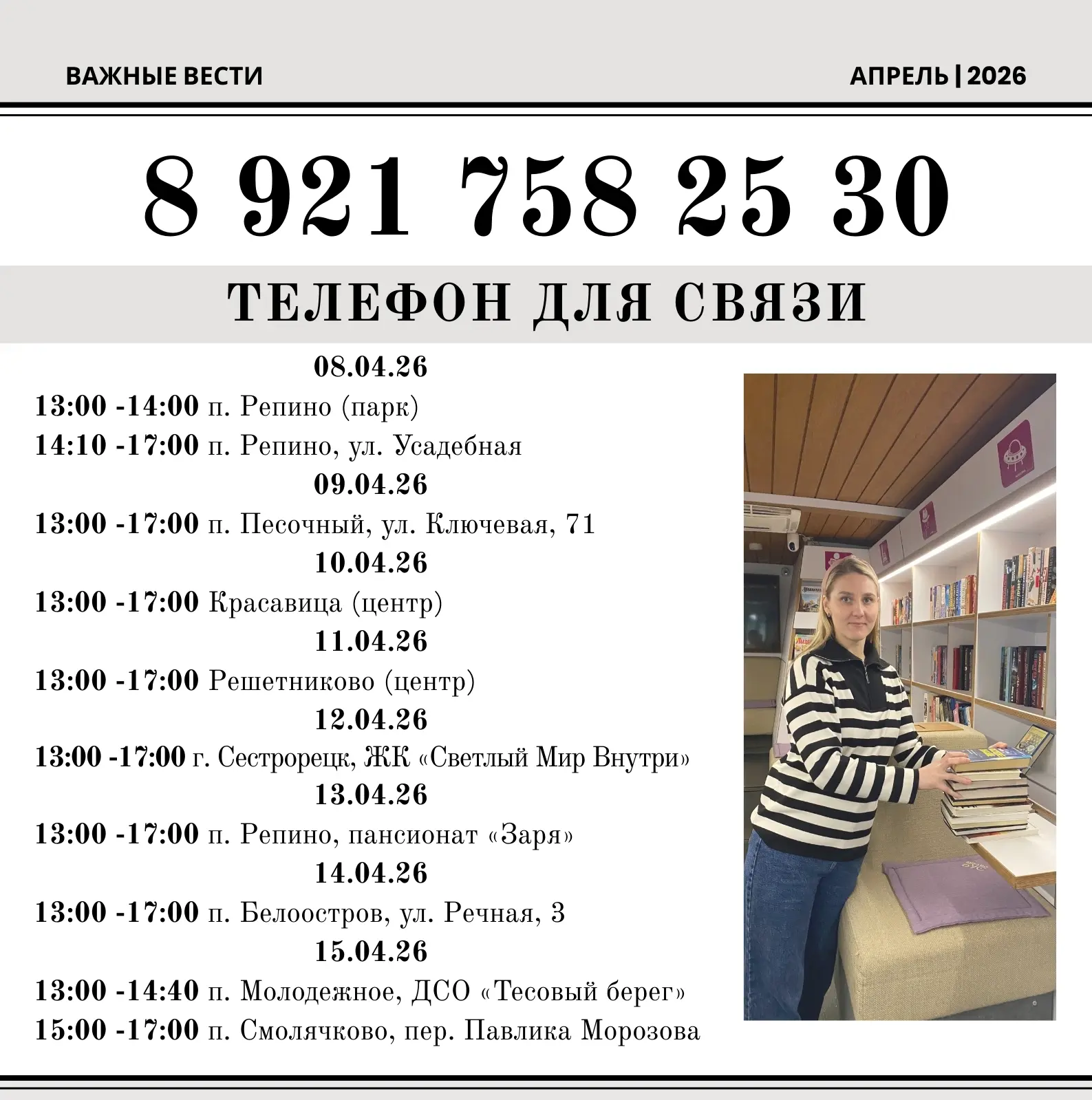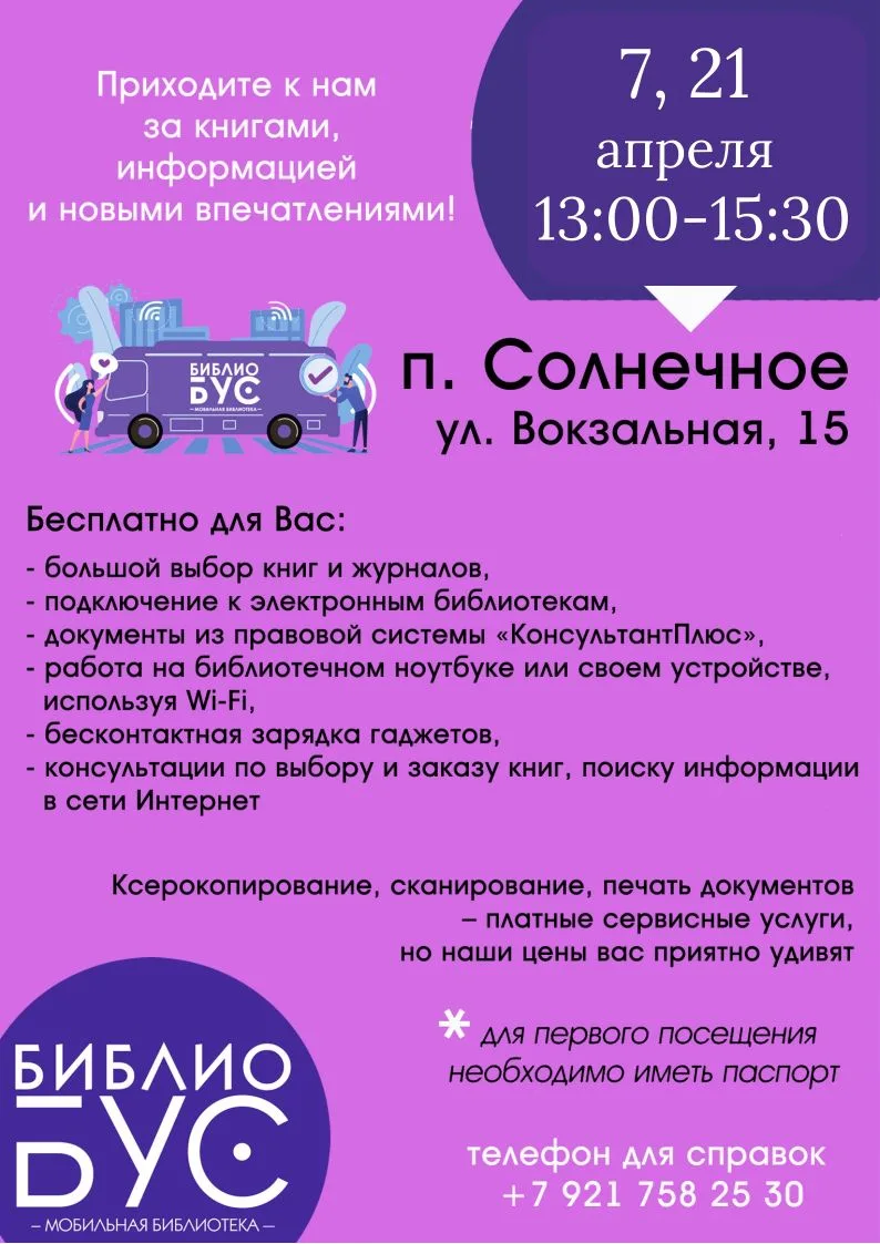 8 921 758 25 30 (в часы работы мобильной библиотеки).
