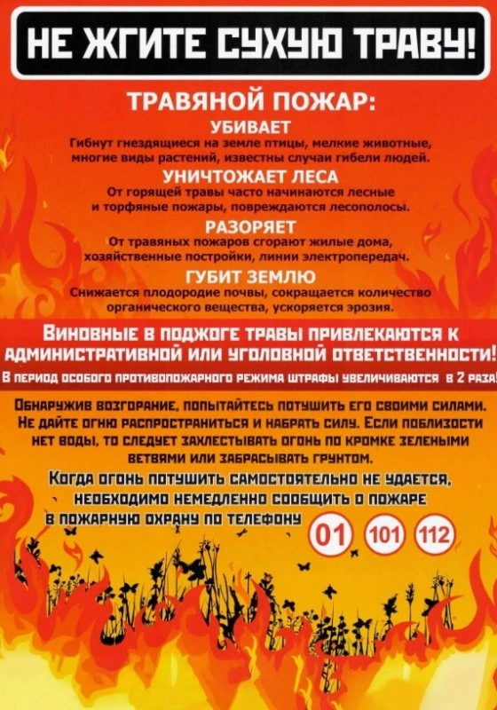— Но если в ветреную погоду горит высокая трава стеной — не геройствуйте. Звоните 101 (или 112). Ждите спасателей на безопасном расстоянии.