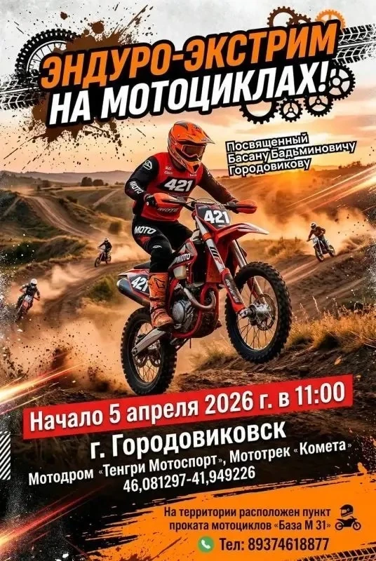 5 апреля в Городовиковске на мототреке «Комета» и мотодромe «Тенгри мотоспорт» состоится чемпионат и первенство Калмыкии по эндуро-экстриму на мотоциклах.