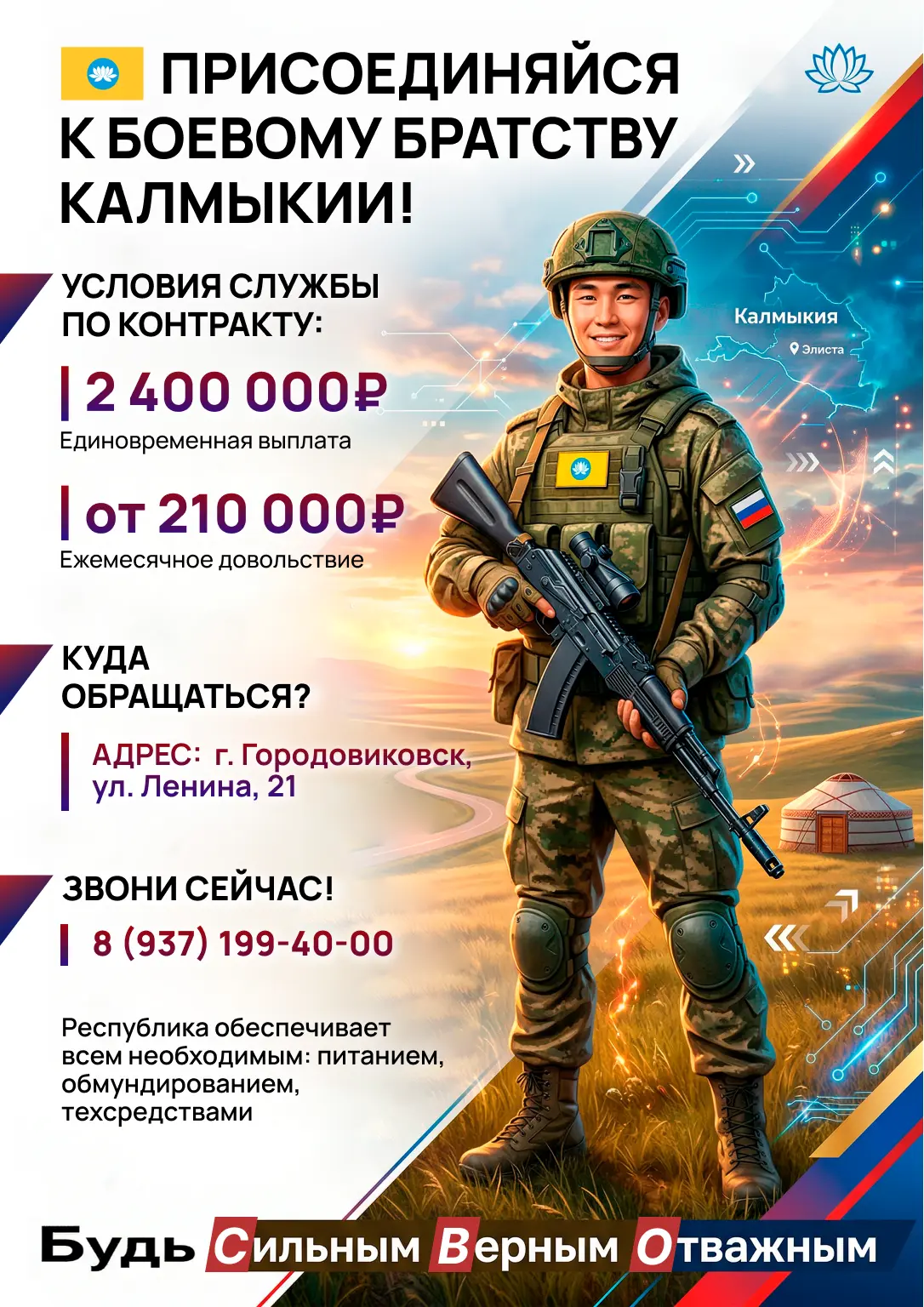 Все подробности можешь узнать по телефону 8-937-199-4000, либо посетив районный военный комиссариат города Городовиковска по адресу: улица Ленина, дом 21.