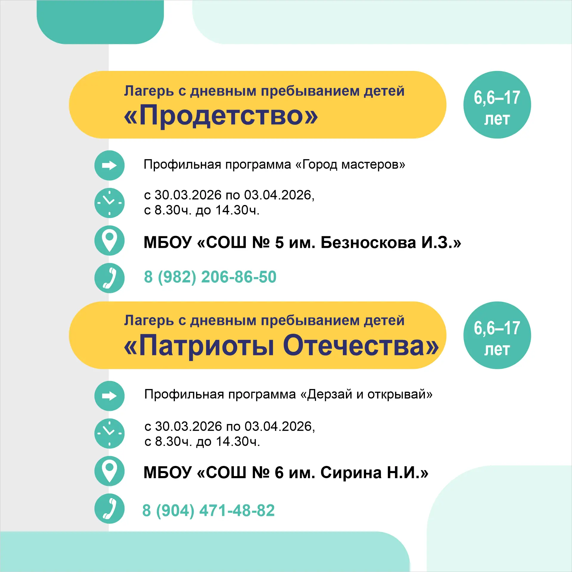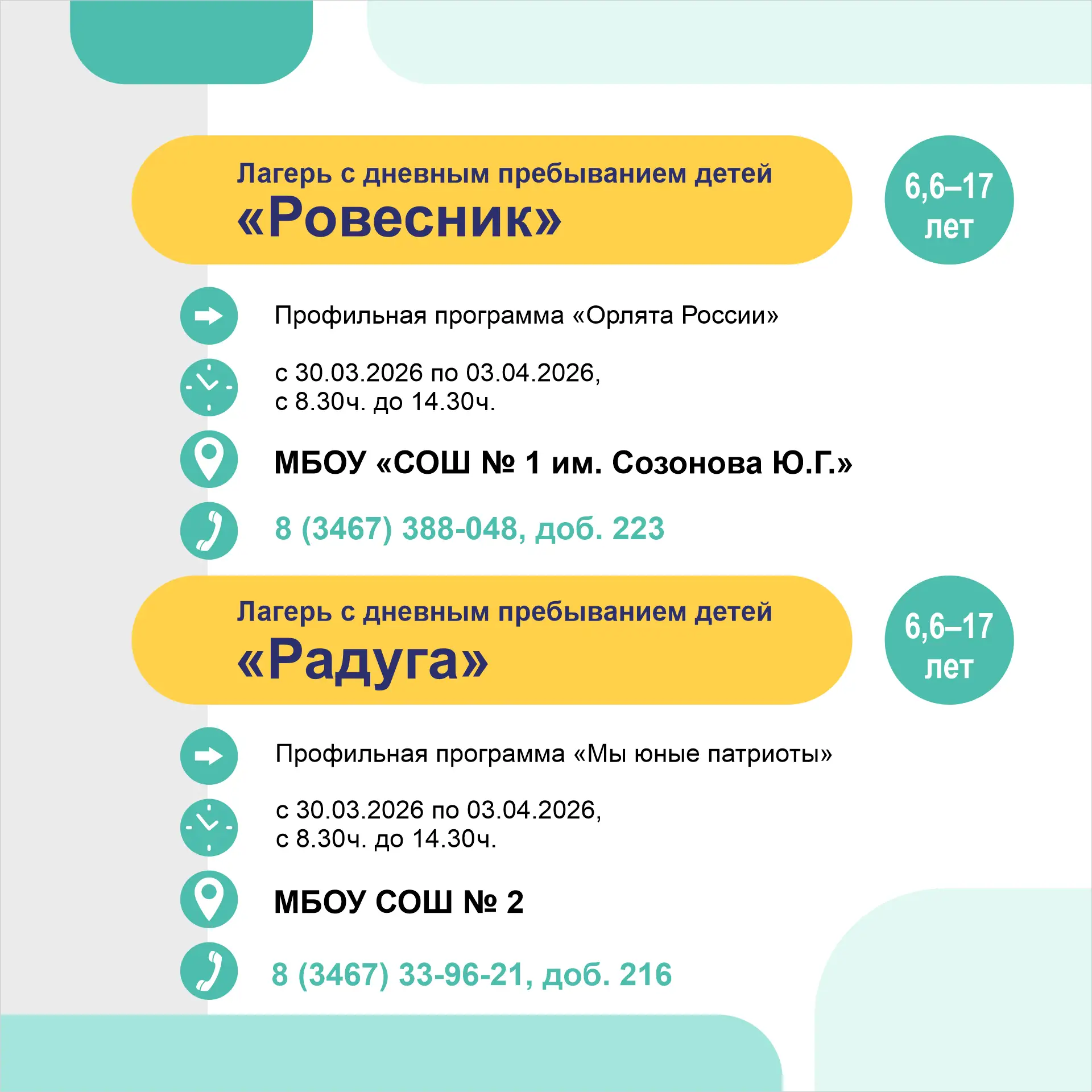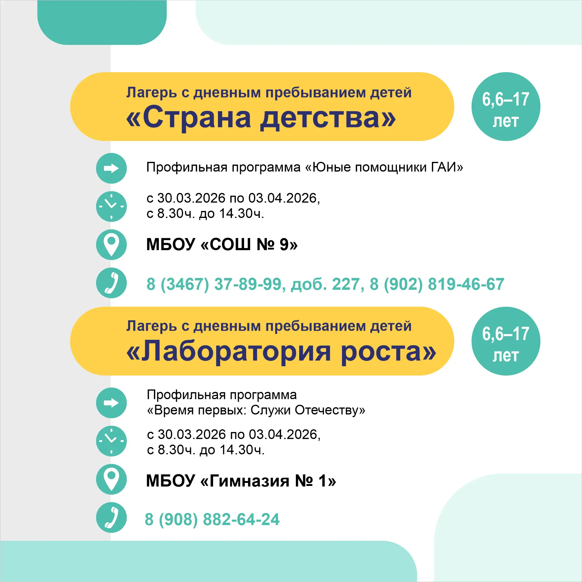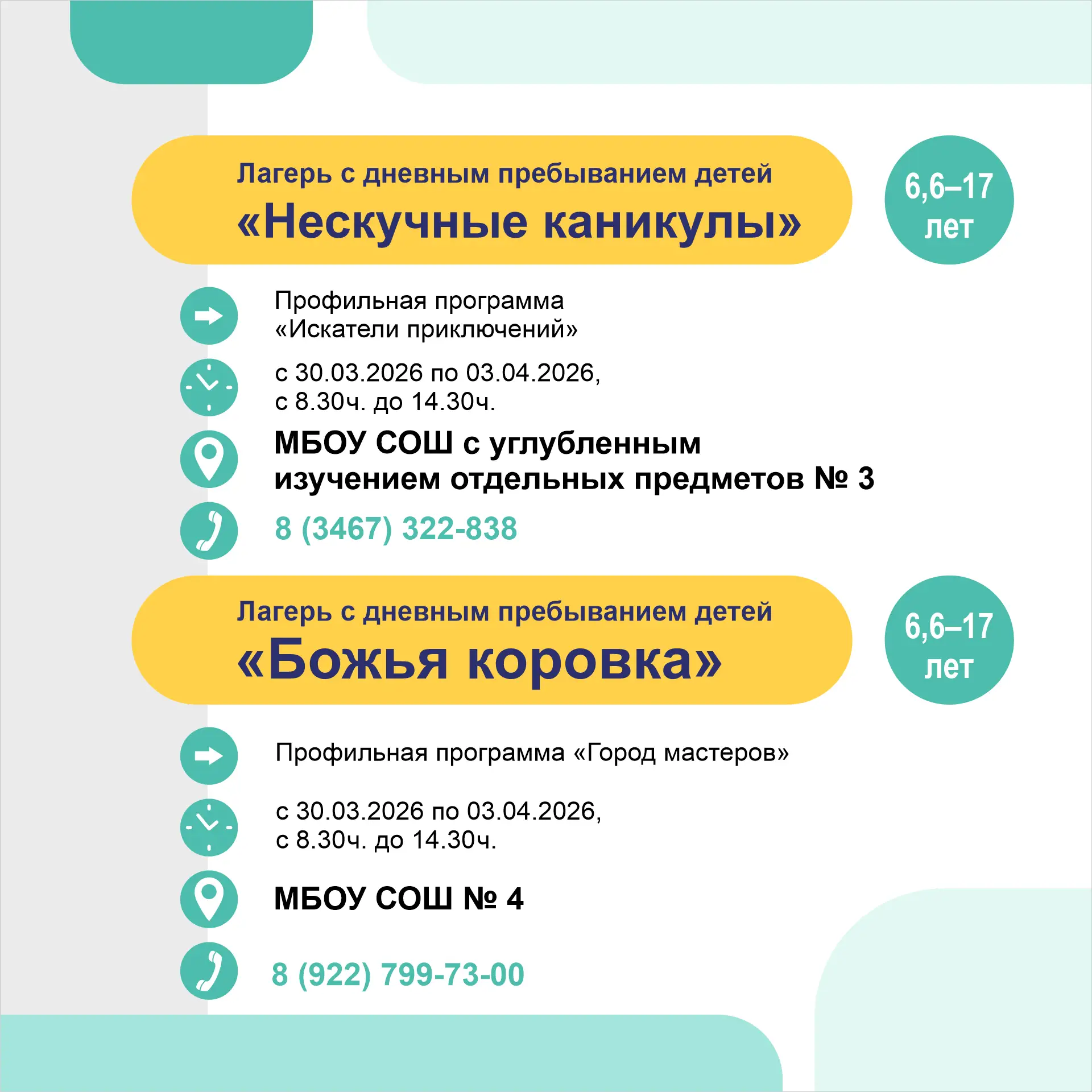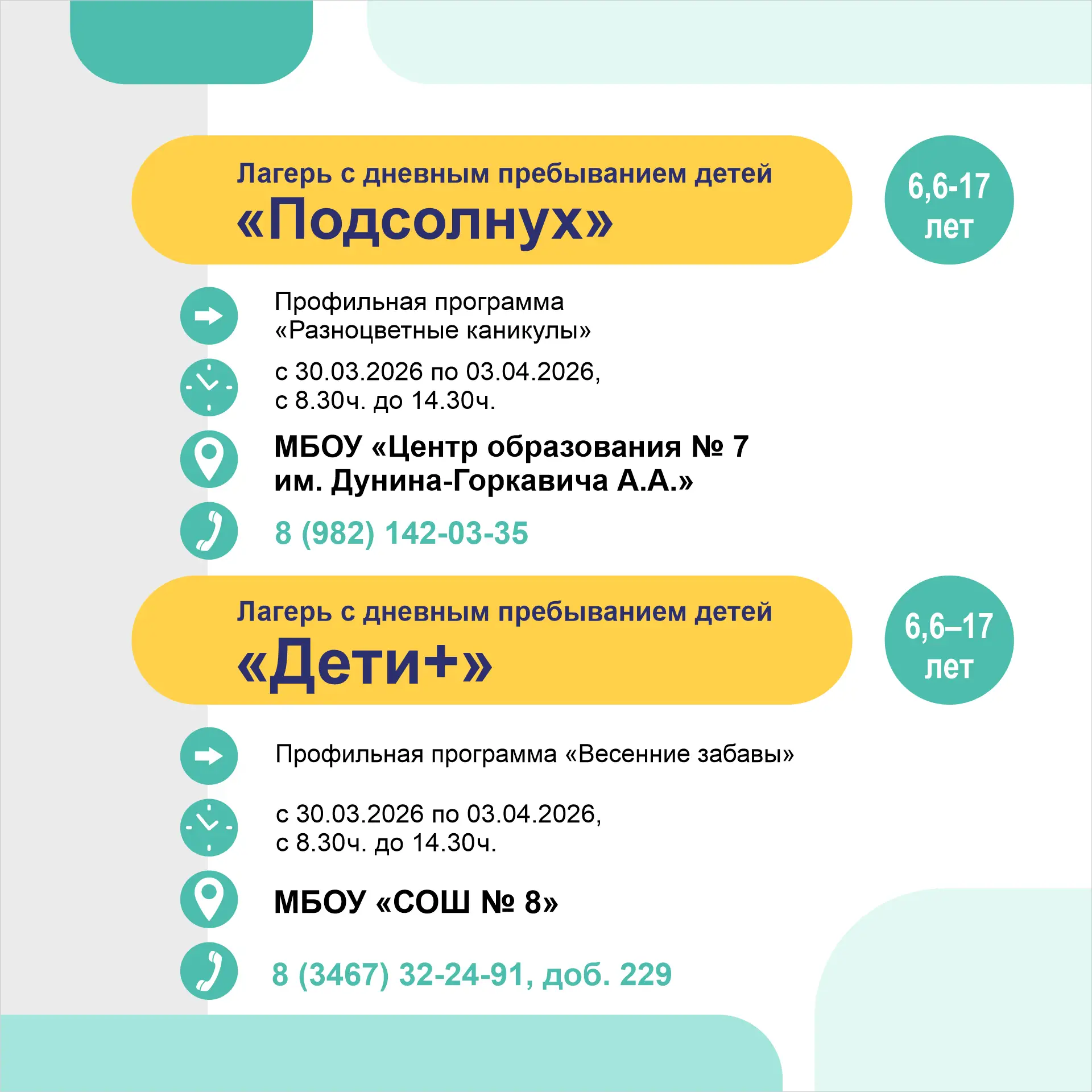🧩 Для школьников Ханты-Мансийска подготовлены увлекательные программы в лагерях с дневным пребыванием на базе общеобразовательных учреждений. Подробности – в карточках.