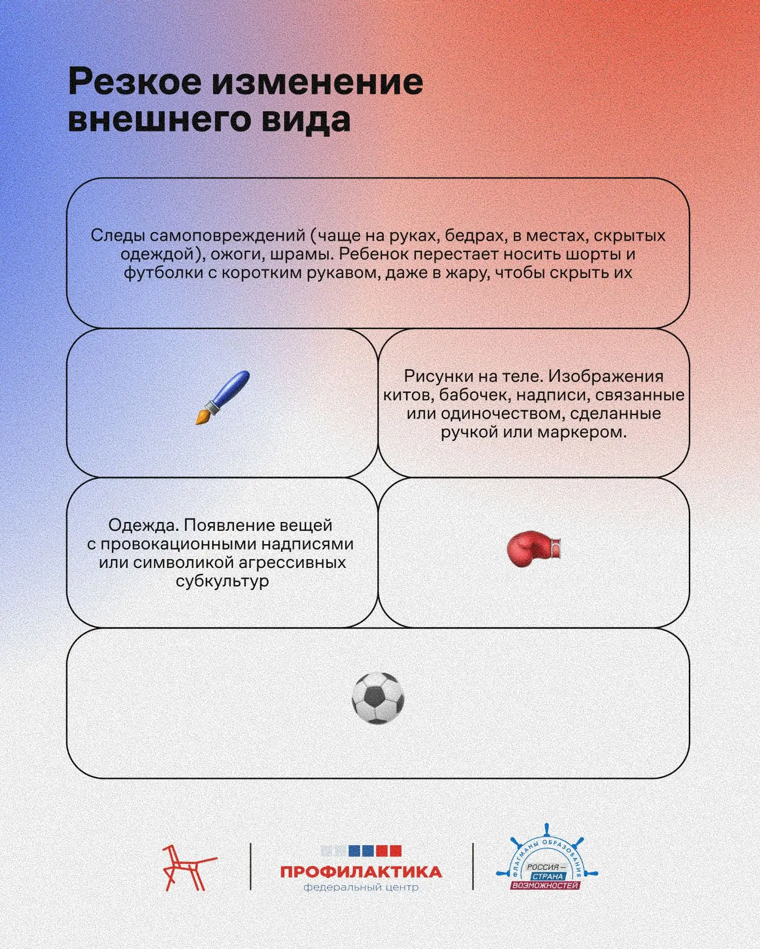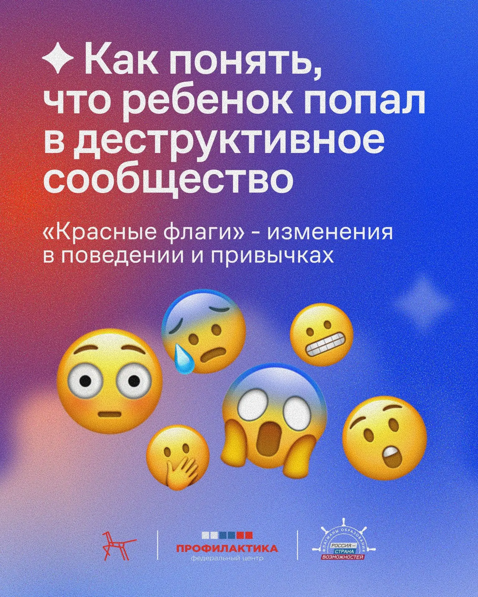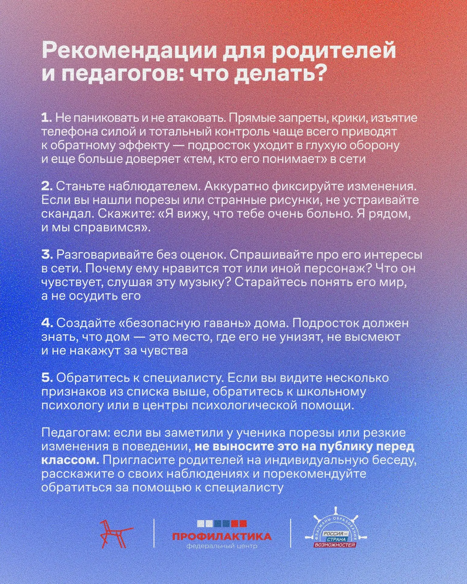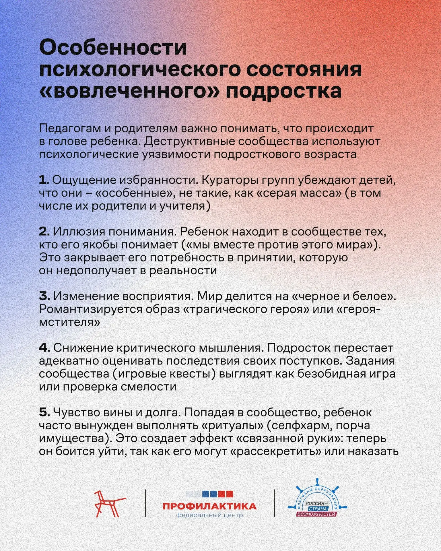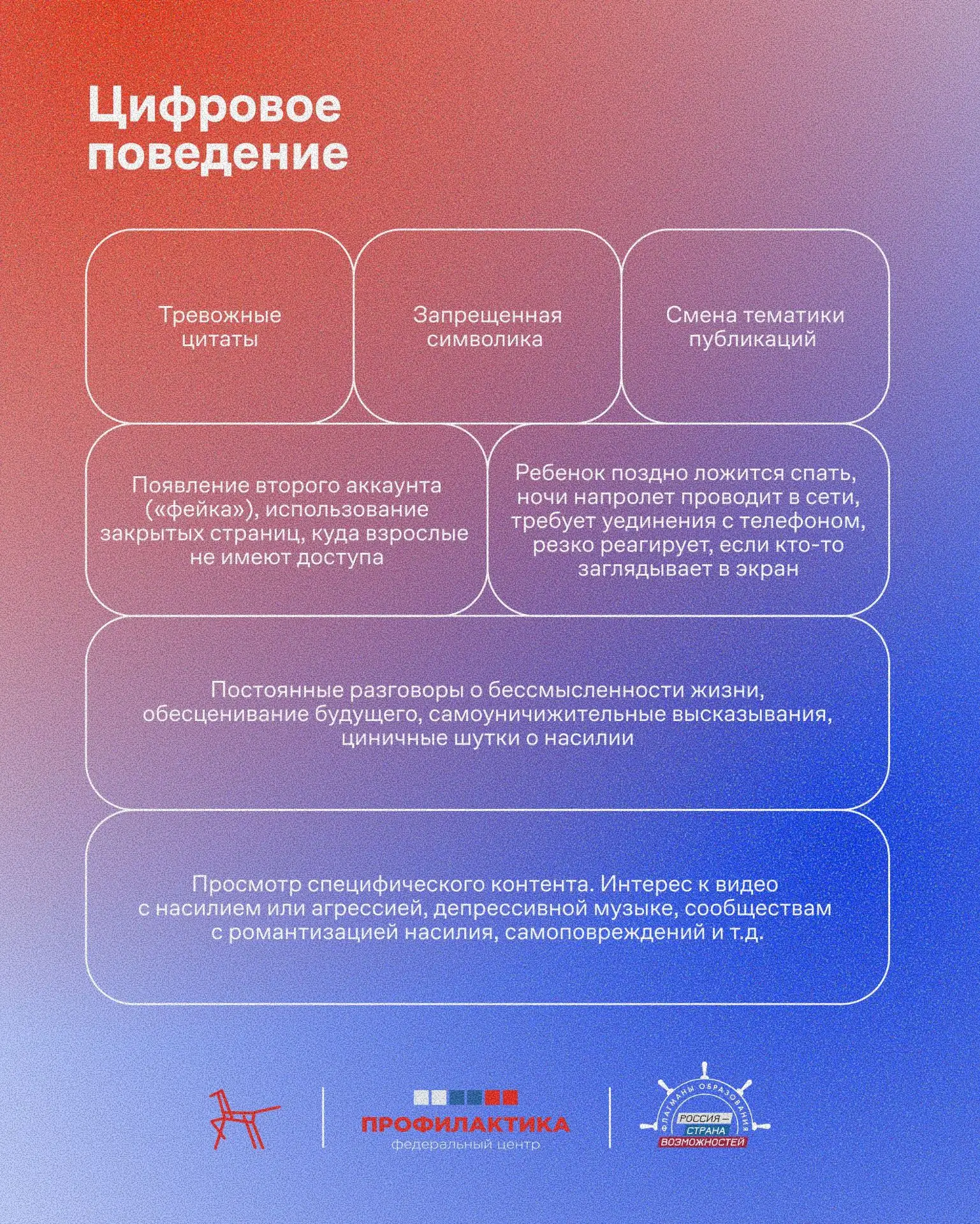 Федеральный центр «Профилактика» подготовил материал, благодаря которому вы сможете вовремя заметить тревожные сигналы. В карточках собраны рекомендации, которые помогут вам распознать маркеры опасного поведения и понять психологические особенности ребенка, попавшего под влияние деструктивного контента.
