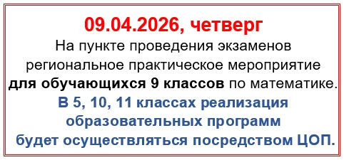 🚩17.03.2026 (вт) в связи с проведением Всероссийского тренировочного мероприятия на пункте проведения экзаменов в МБОУ "СОШ № 1 им. Созонова Ю.Г." реализация образовательных программ в 5-11 классах будет осуществляться посредством ЦОП (ГИС "Образование Югры" - https://cop.admhmao.ru)