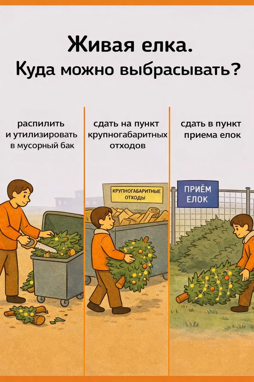 — Если ёлка распиленная — выбросить части в контейнер для ТКО (твердых коммунальных отходов)