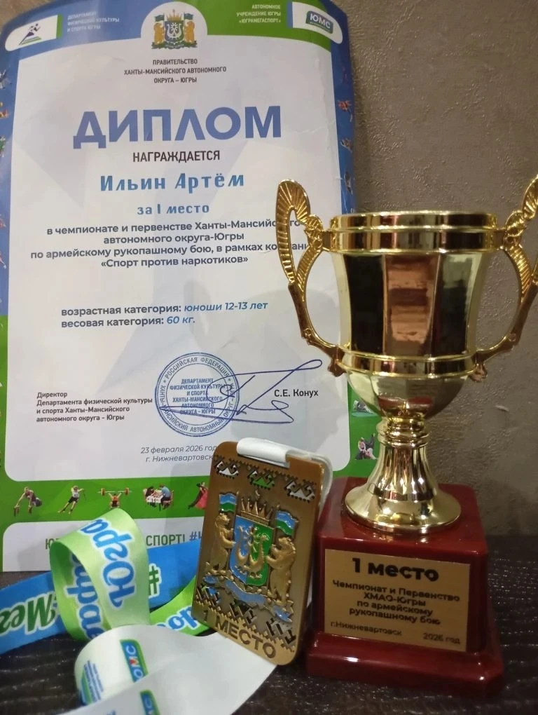 Ильин Артём из 7д занял первое место 🥇в чемпионате и первенстве ХМАО по армейскому рукопашному бою в возрастной категории 12-13 лет . в г. Нижневартовск 23 февраля.