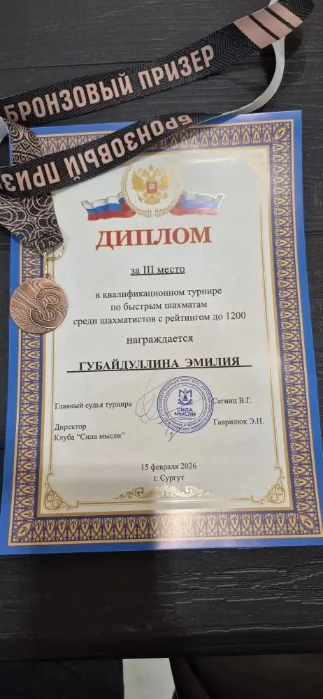 Она заняла 3 место в квалифицированном турнире по быстрым шахматам среди шахматистов с рейтингом до 1200! 🥉