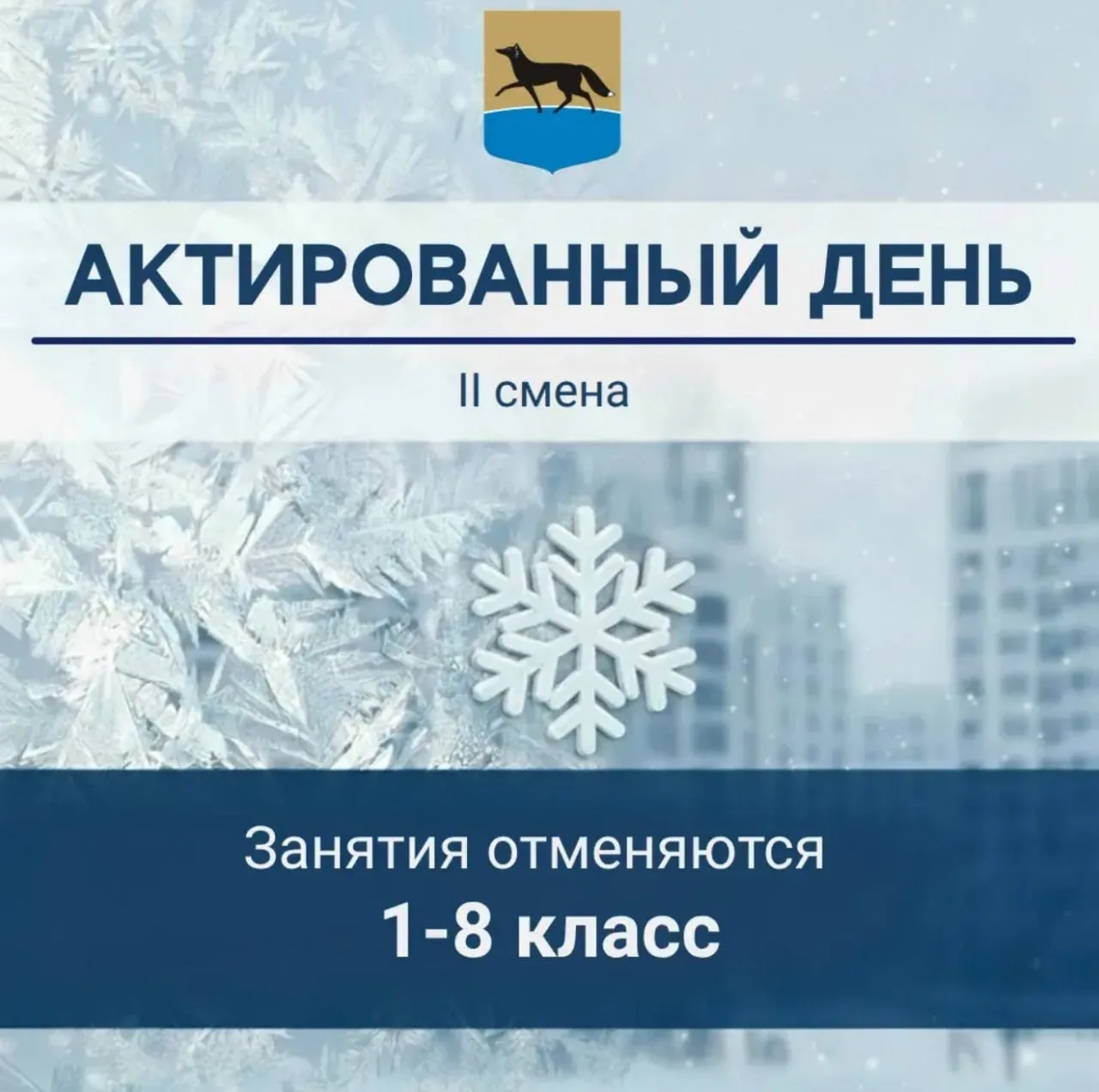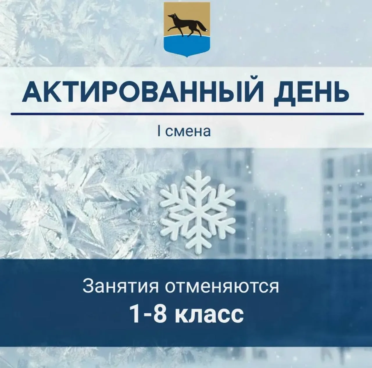 ❗️Администрация города сообщает, что в связи с низкой температурой воздуха 20.02.2026 в муниципальных общеобразовательных учреждениях Сургута отменяются занятия для 1-8 классов 1 смены. Температура воздуха -31,4 °С, скорость ветра 4 м/с.