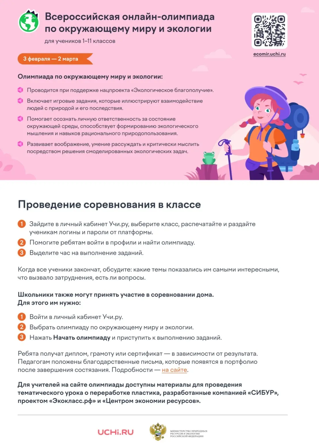 Всероссийская онлайн-олимпиада по окружающему миру и экологии для школьников 1-11 классов (далее-Олимпиада), которая пройдет с 3 февраля по 2 марта 2026 года.
