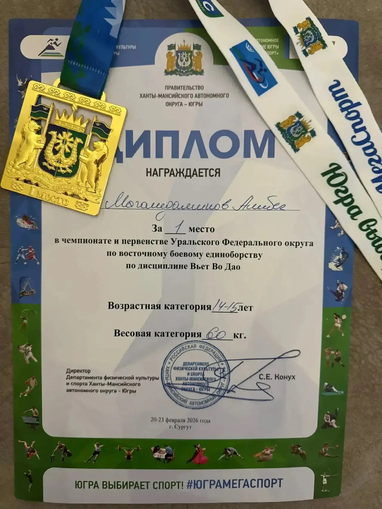 Поздравляем с яркой и достойной победой 🏆🤼 ученика 8ж класса Магомедаминова Алибега с 1 местом 🥇 на Чемпионате и первенстве Уральского Федерального округа по восточному боевому единоборству.
