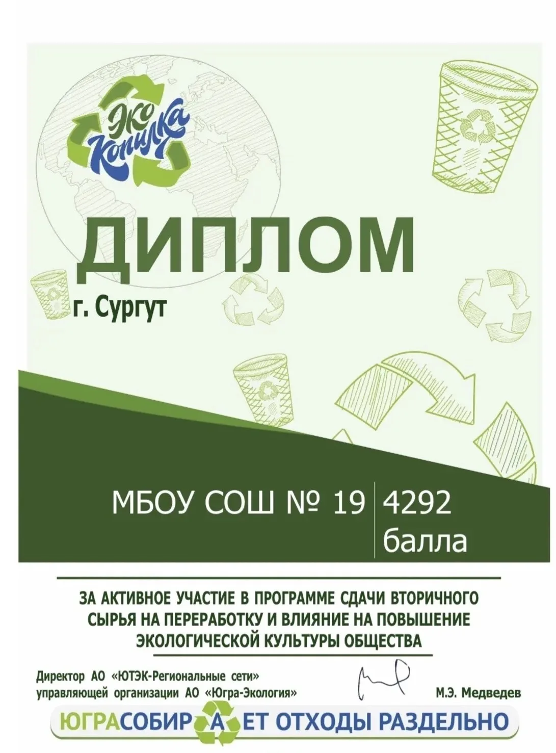 За активное участие в программе сдачи вторичного сырья на переработку и вклад в повышение экологической культуры общества. Наша школа получила диплом и набрала 4292 балла! 🏅