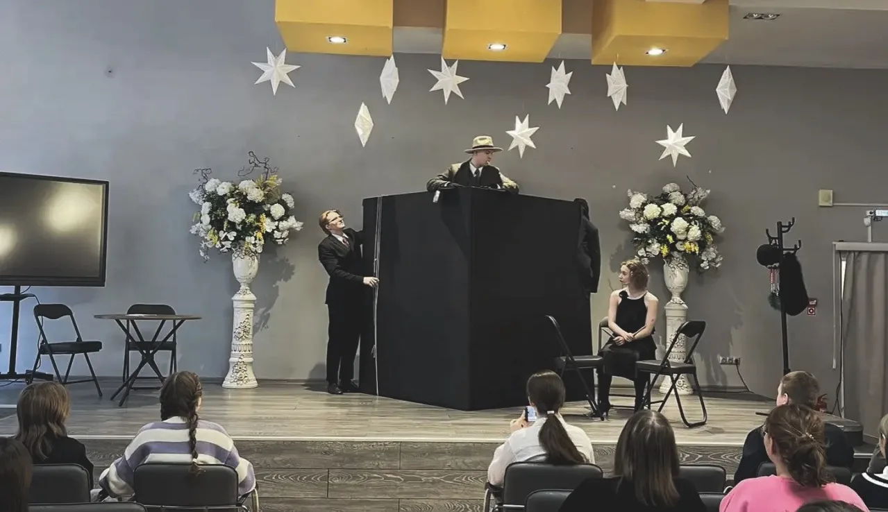 Двери школы распахнулись для артистов драматического театра города Сургута, которые представили вниманию учащихся и педагогов постановку, наполненную сатирой и глубоким социальным подтекстом.
