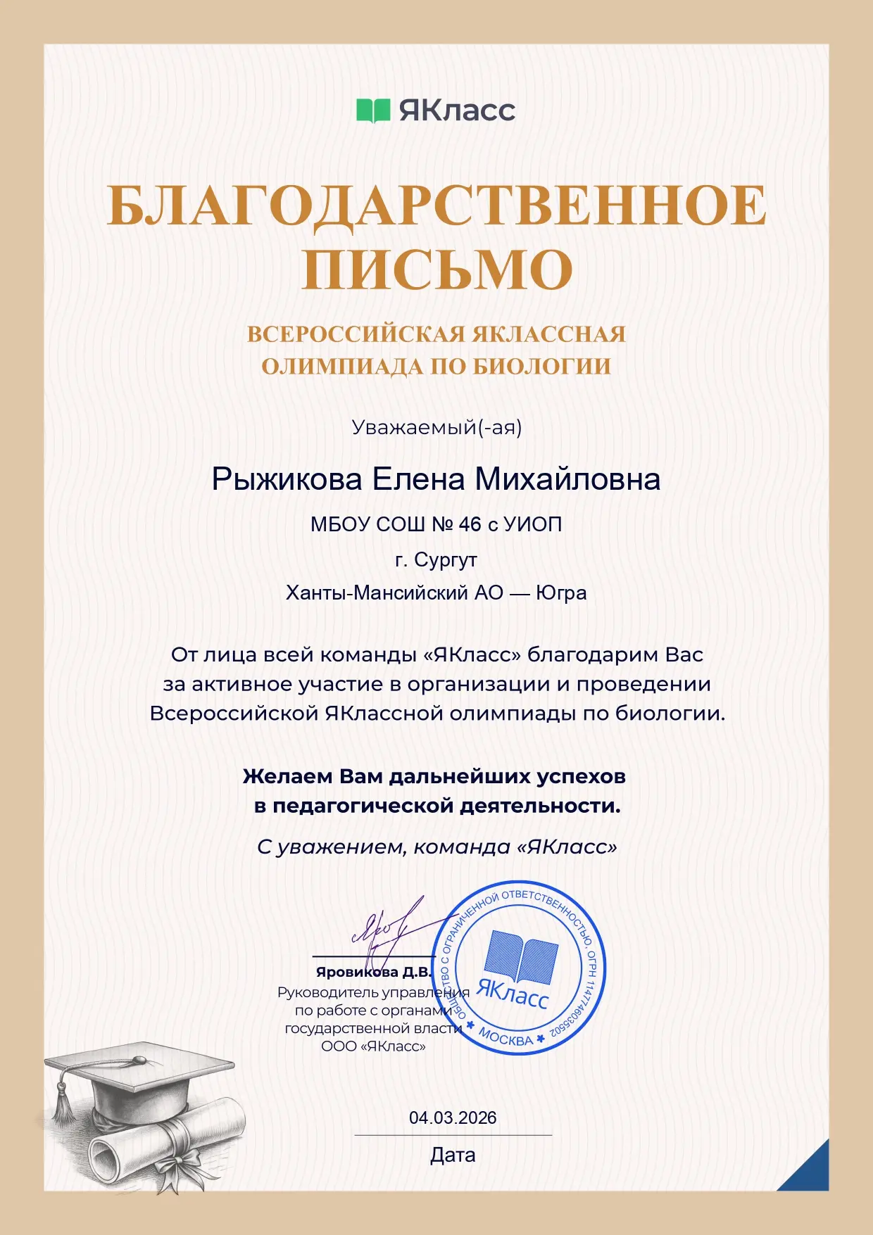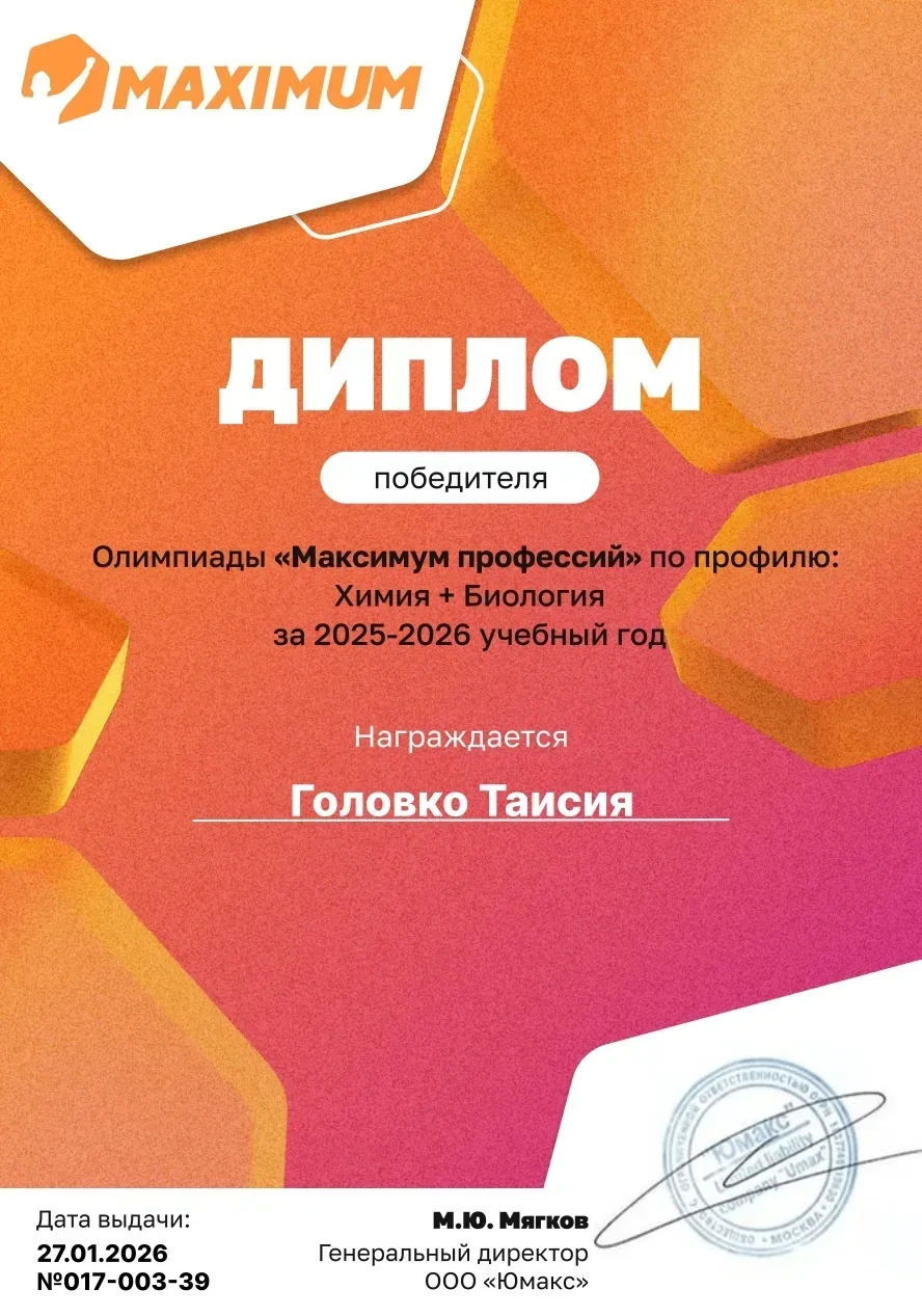 Поздравляем нашу ученицу Таисию Головко (9Б класс)! Она стала победителем олимпиады «Максимум профессий», включенной в перечень олимпиад и иных интеллектуально-творческих мероприятий на 2025/26 учебный год, утвержденный Министерством просвещения Российской Федерации. Данные о достижениях Таисии будут внесены в Государственный информационный ресурс (ГИР) о лицах, проявивших выдающиеся способности.