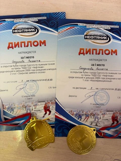 Солодилова Виолетта — двукратная чемпионка Открытого Кубка Сургута по лыжным гонкам! 🏆🏆🎿11 и 12 апреля на соревнованиях в рамках Открытого Кубка города Сургута по лыжным гонкам ученица 5«Е» класса Солодилова Виолетта завоевала сразу две золотые медали! 🥇🥇Это ещё одно подтверждение её высокого мастерства, упорства и любви к спорту. Виолетта продолжает радовать нас своими победами — и мы гордимся каждой из них! 💪❄️Поздравляем Виолетту и её наставников с блестящим результатом! Желаем новых рекордов и только первых мест! 🔥