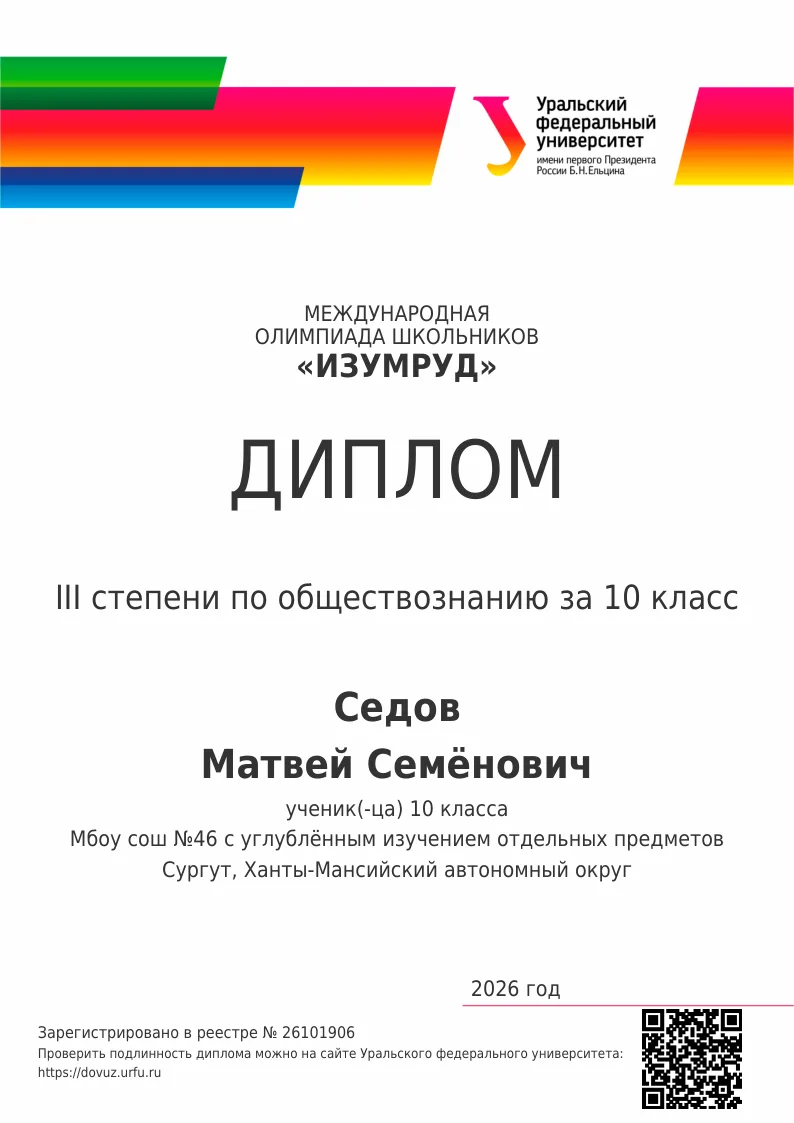 Поздравляем Седова Матвея, ученика 10Б класса, с блестящим достижением — он стал призёром международной олимпиады Уральского федерального университета «Изумруд» для учащихся 8–11 классов по обществознанию! 🌍📚