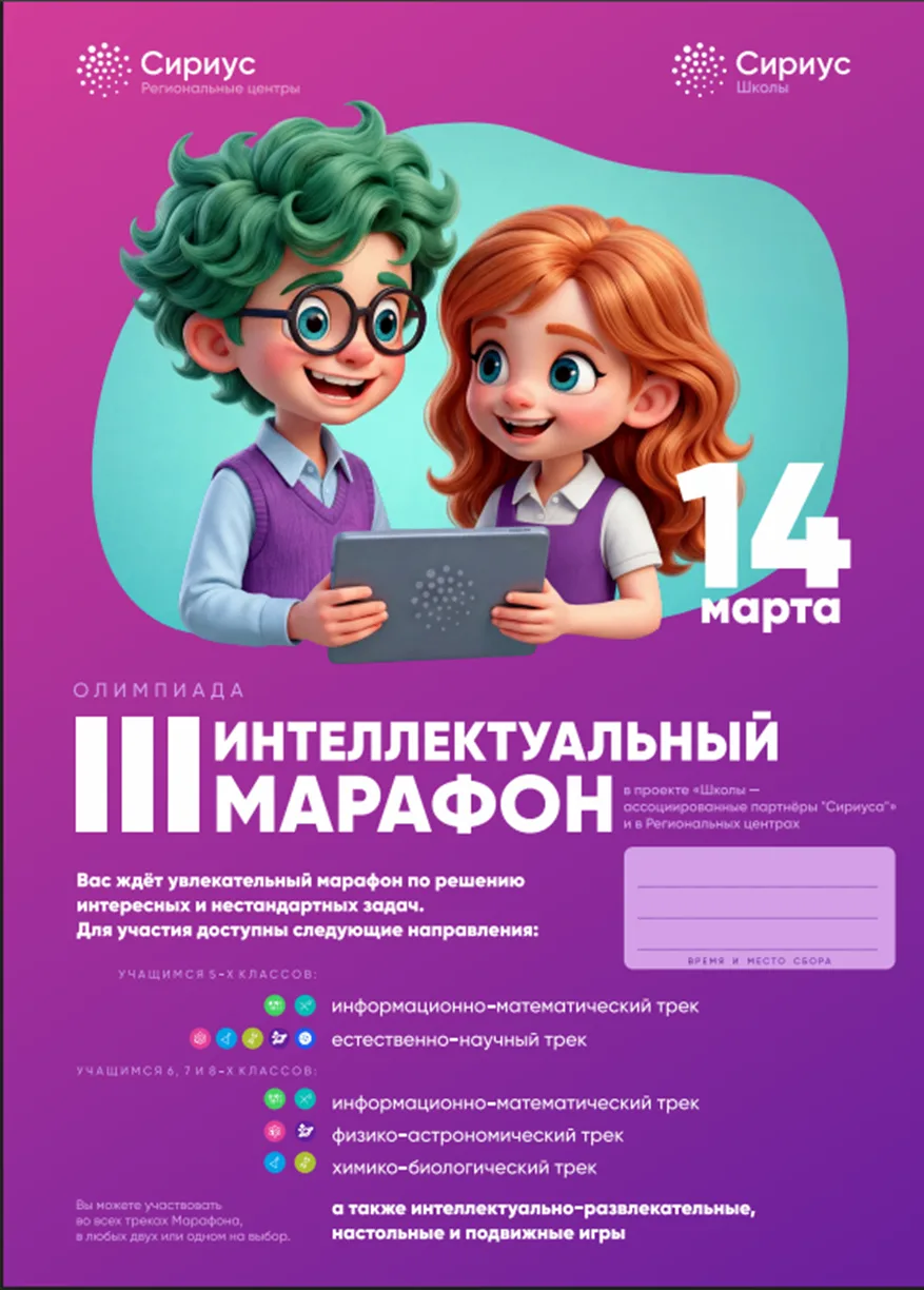 14 марта в нашей школе в 10:00 в рамках проекта «Школы – ассоциированные партнеры «Сириуса». пройдет Олимпиада «III Интеллектуальный марафон».