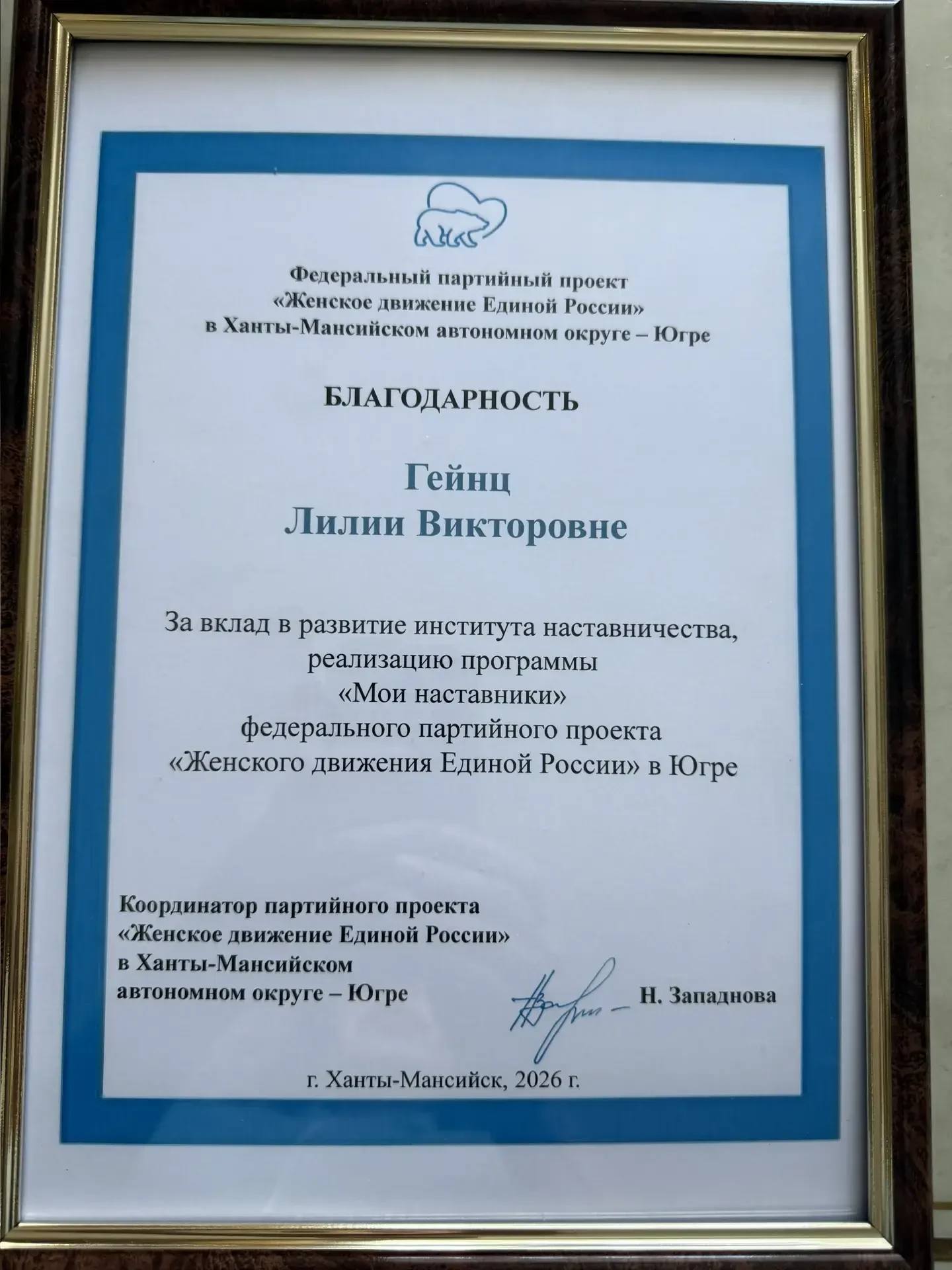 Итогом этой работы стало официальное признание: Лилия Викторовна награждена Благодарностью федерального партийного проекта «Женское движение Единой России» в Югре — за вклад в развитие института наставничества и реализацию программы «Мои наставники».