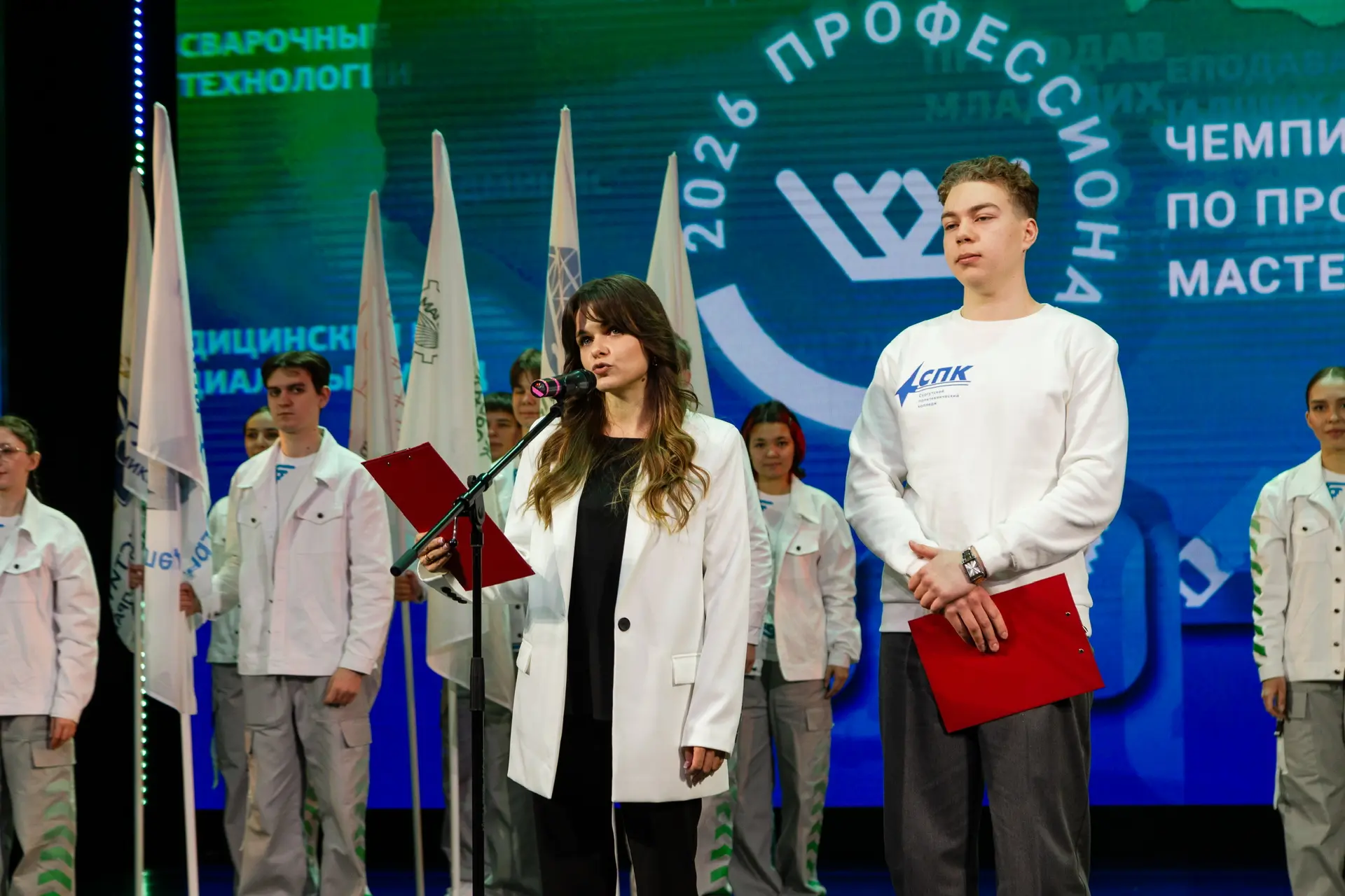 По традиции, конкурсанты и эксперты - в лице главного эксперта компетенции «Документационное обеспечение управления и архивоведение»Екатерины Сергеевны Ворожбет и участника компетенции «Облицовка плиткой» Давида Юсуфова - принесли торжественную клятву от имени всех экспертов и участников чемпионата.
