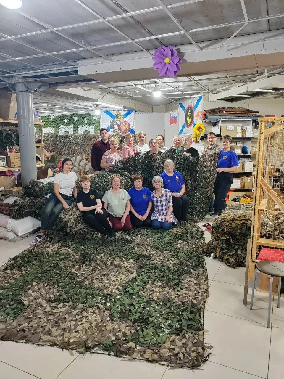 В уютной, дружеской обстановке наши сотрудники научились плести маскировочные сети для бойцов, находящихся в зоне СВО.