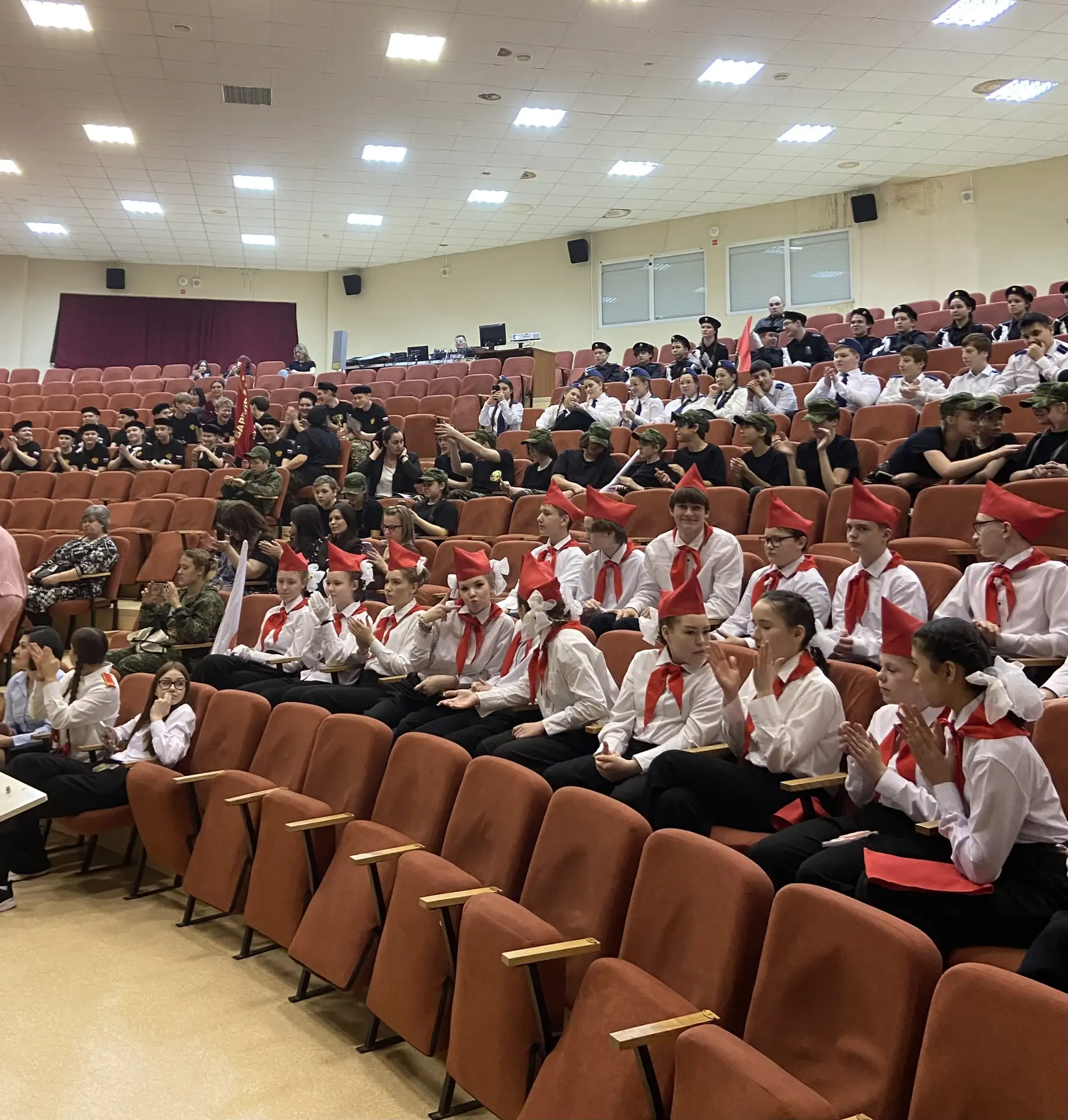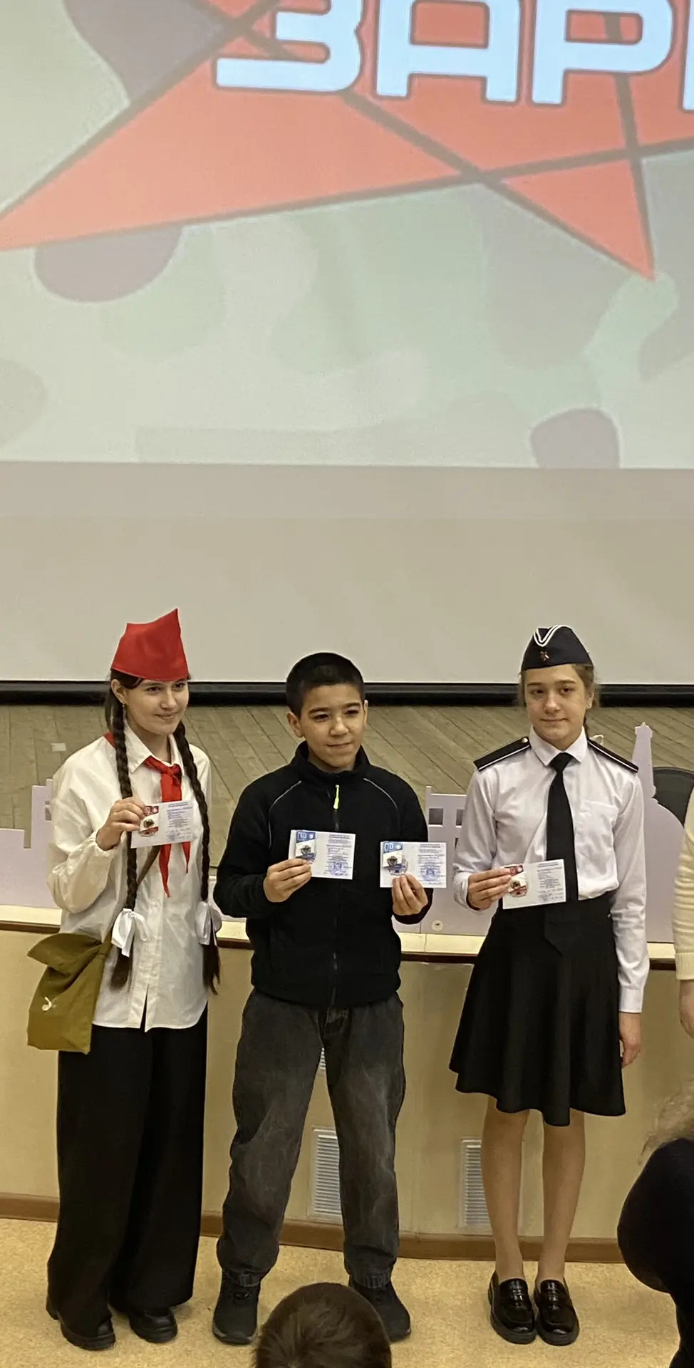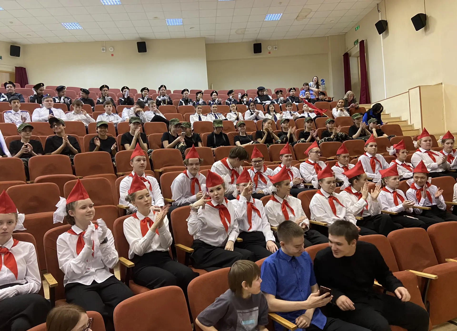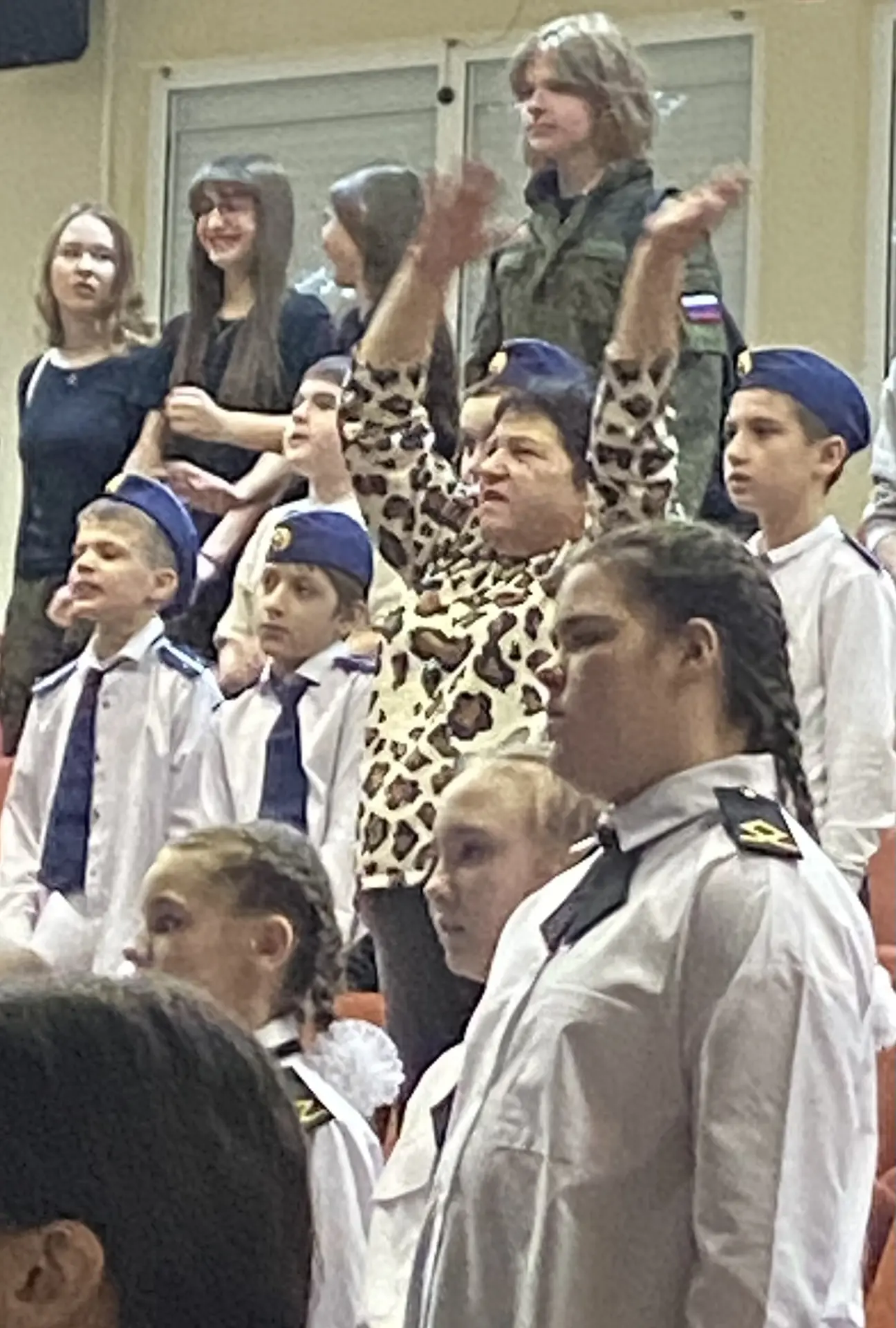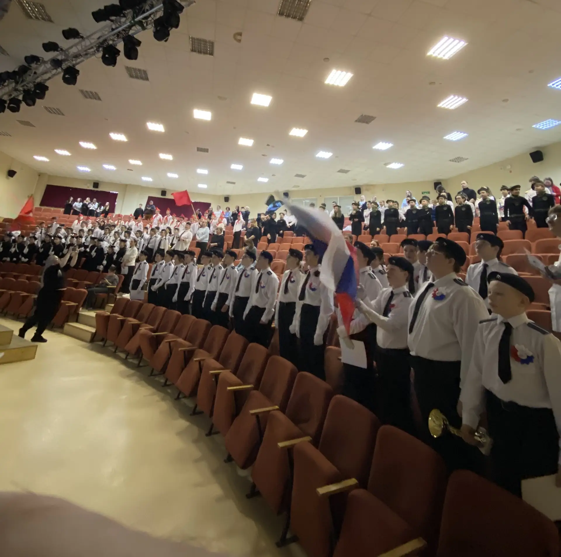 Шестиклассники поздравляют друг друга, смотрят на президента, поют вместе с Газмановым, радуются за значкистов ГТО