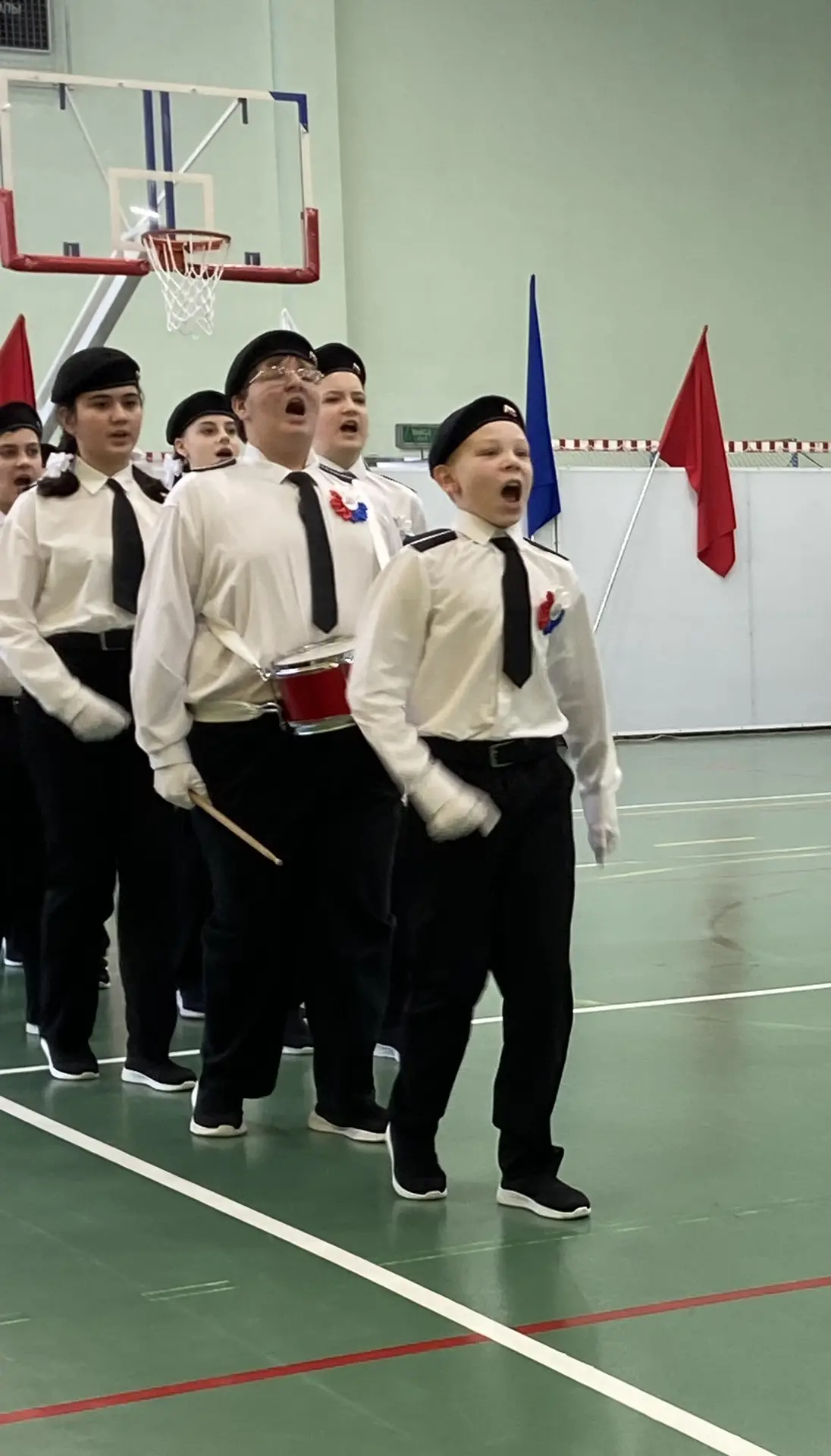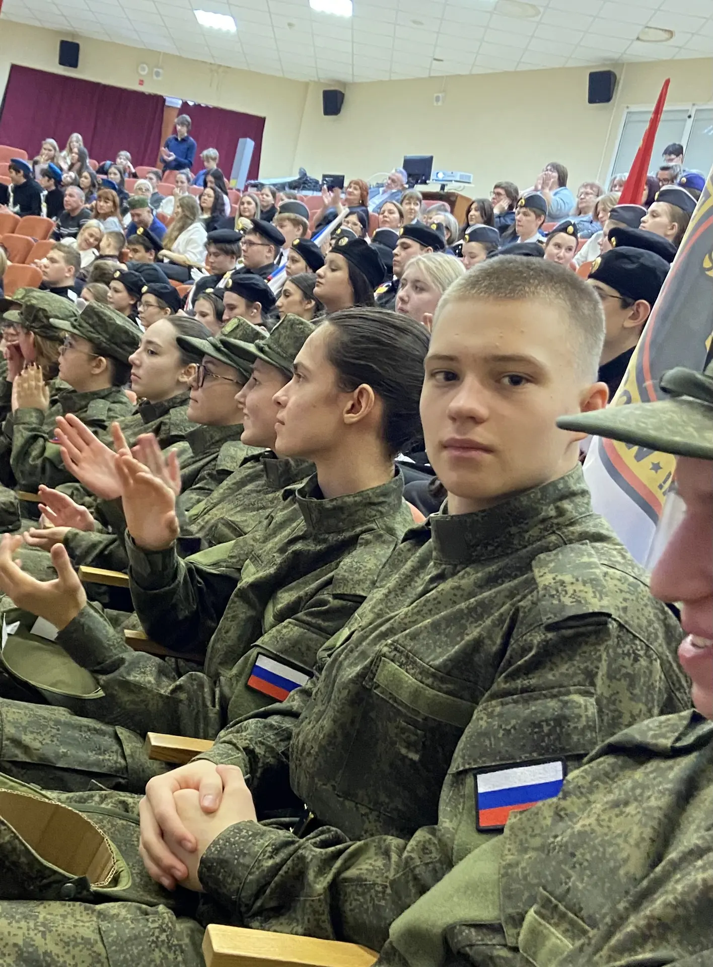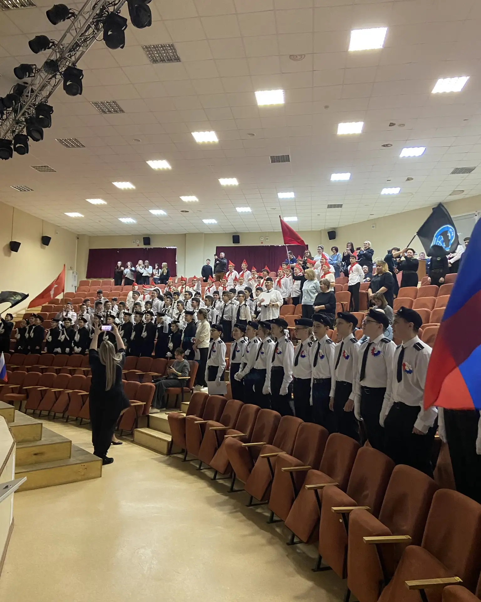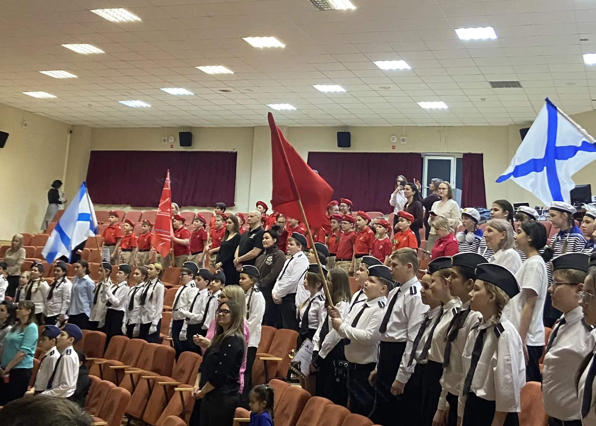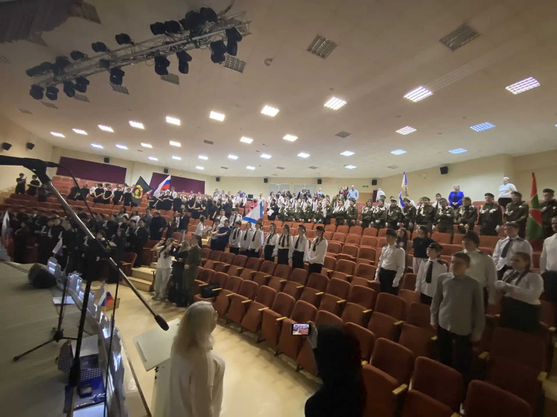 Шестиклассники поздравляют друг друга, смотрят на президента, поют вместе с Газмановым, радуются за значкистов ГТО