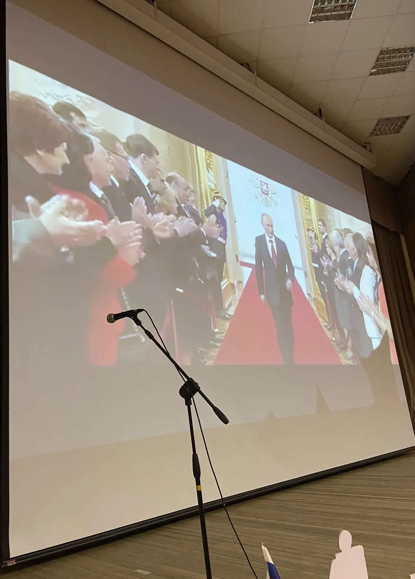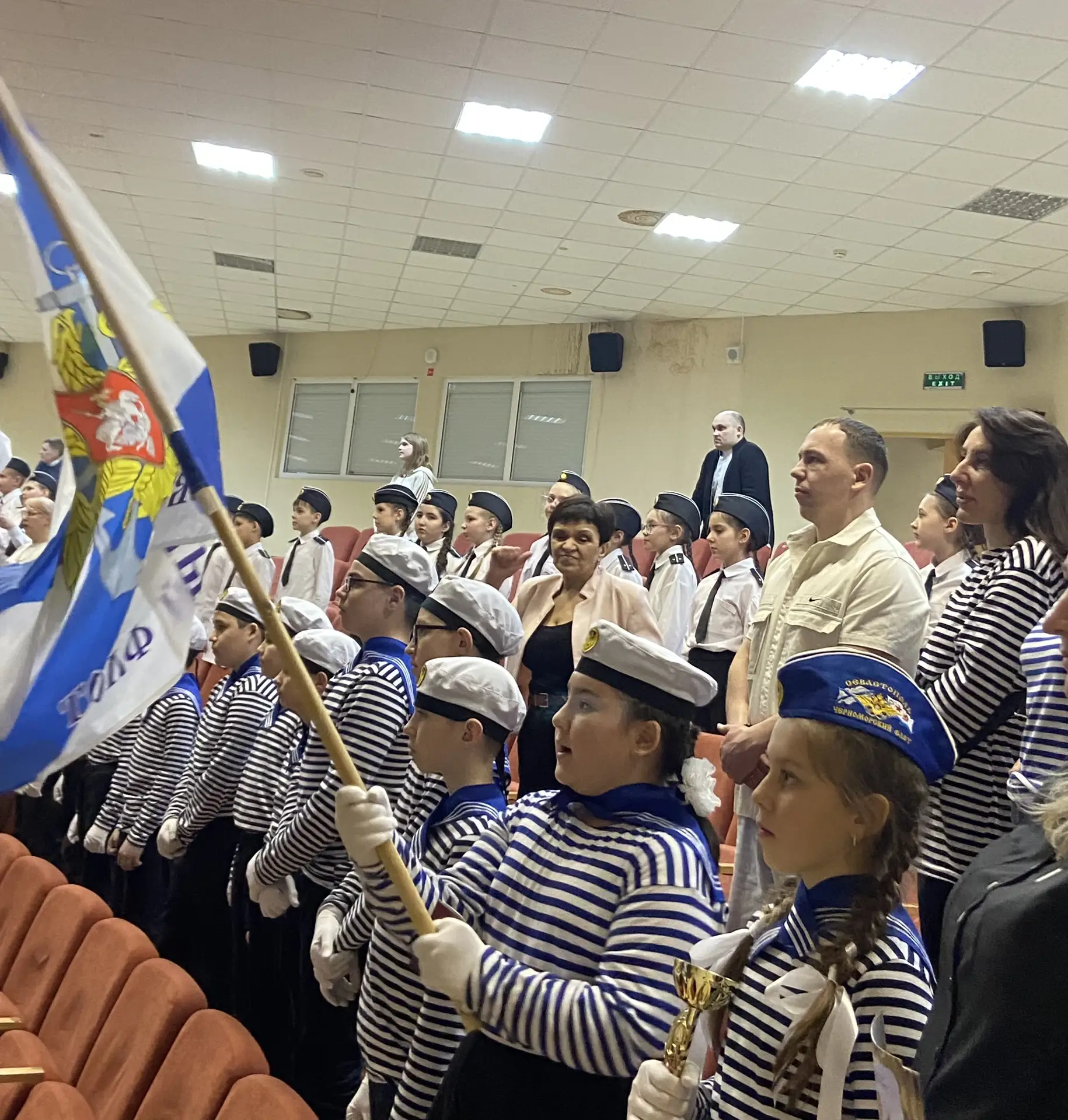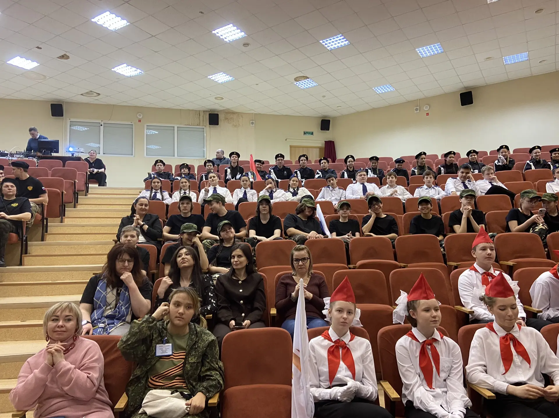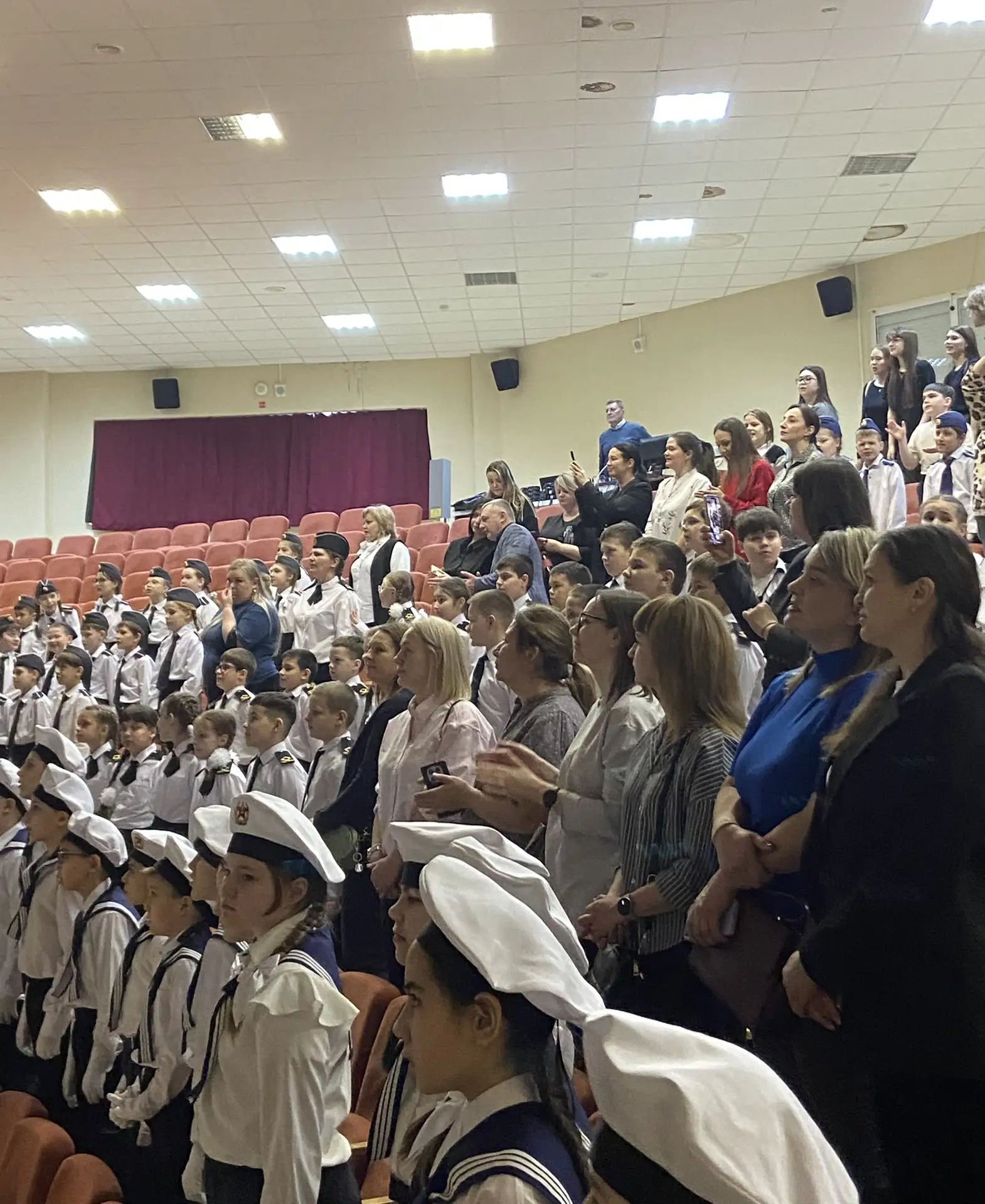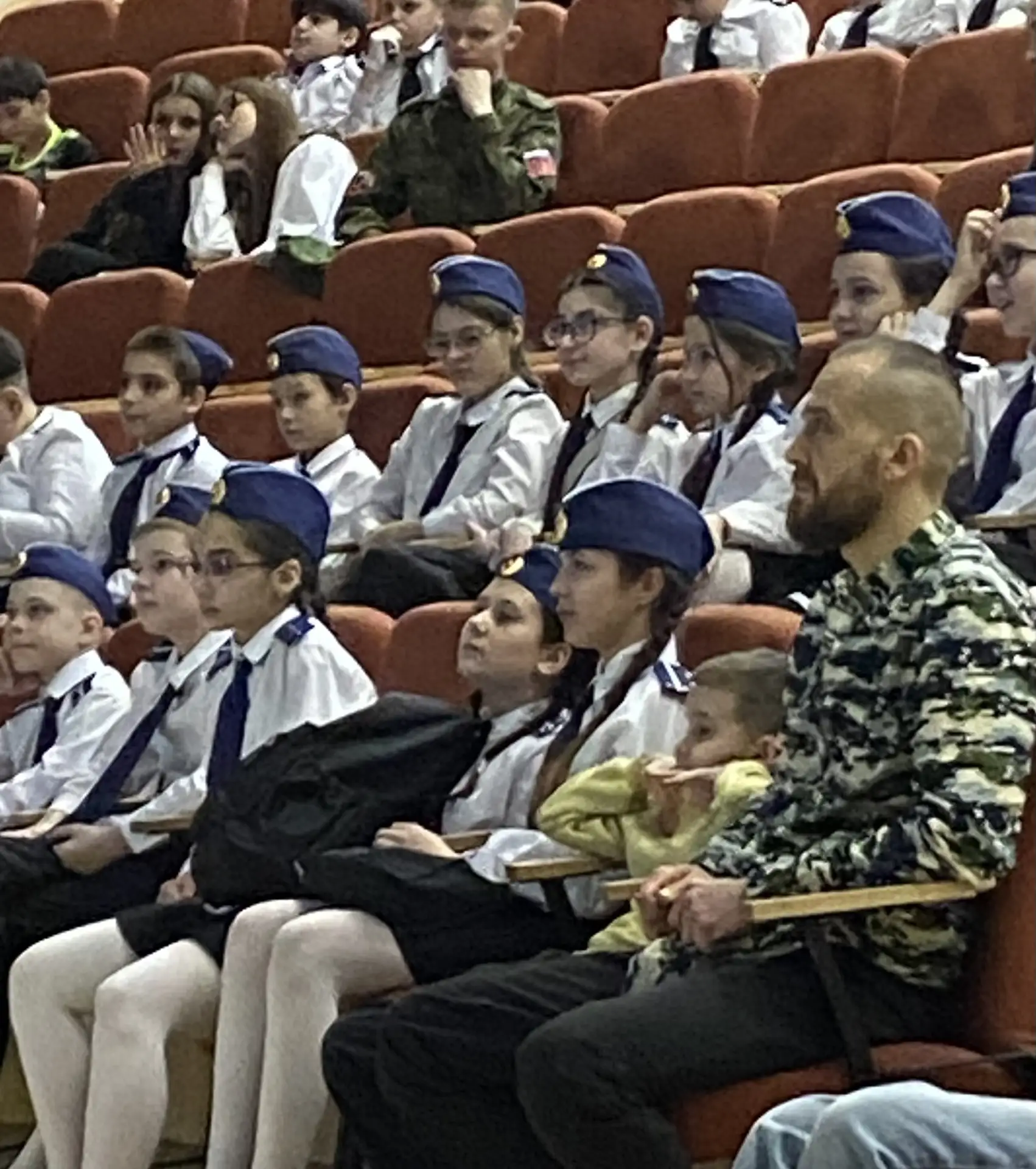 Шестиклассники поздравляют друг друга, смотрят на президента, поют вместе с Газмановым, радуются за значкистов ГТО
