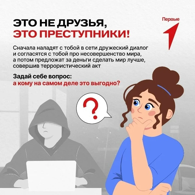 ⛓ Онлайн-общение не должно ставить под угрозу твою безопасность, свободу и будущее. Сохраняй критическое мышление, делись этим постом с близкими и друзьями из Движения Первых, и всегда задавай себе простой вопрос: кому на самом деле выгодно то, что мне предлагают?