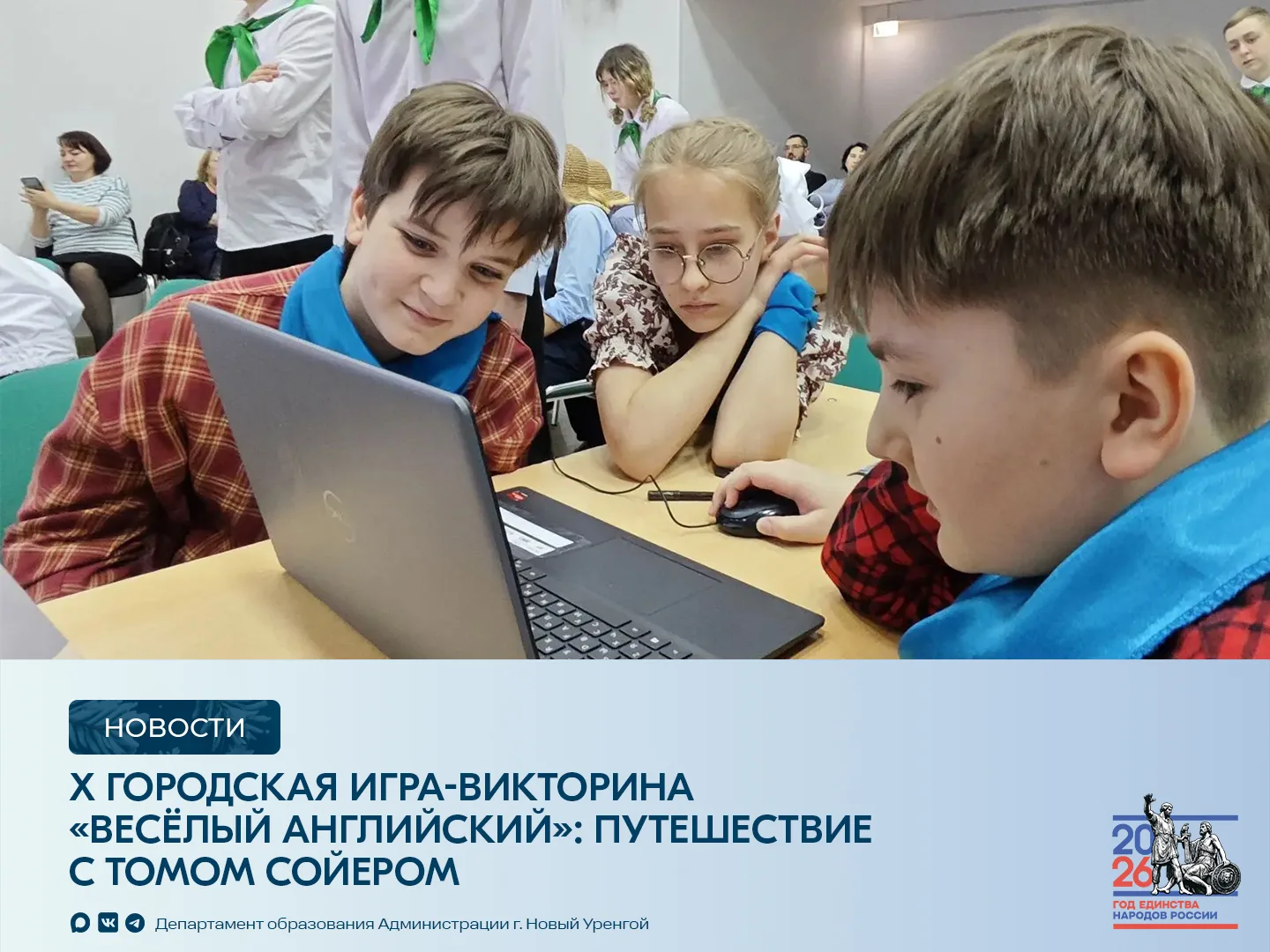 ℹ️Поздравляем победителей! Призовые места распределились следующим образом: 1‑е место — МБОУ «СШ „Перспектива“», 2‑е место — МБОУ «СШ им. Д.И. Коротчаева», 3‑е место — МБОУ СОШ № 3. Также грамоты вручены победителям в специальных номинациях, среди которых «Эрудиты. Английский глазами детей», «Знатоки грамматики английского языка», «Лучшее перевоплощение. Ожившая классика» и «За волю к победе и авантюрный дух». Благодарим всех участников и желаем дальнейших успехов в изучении английского языка.
