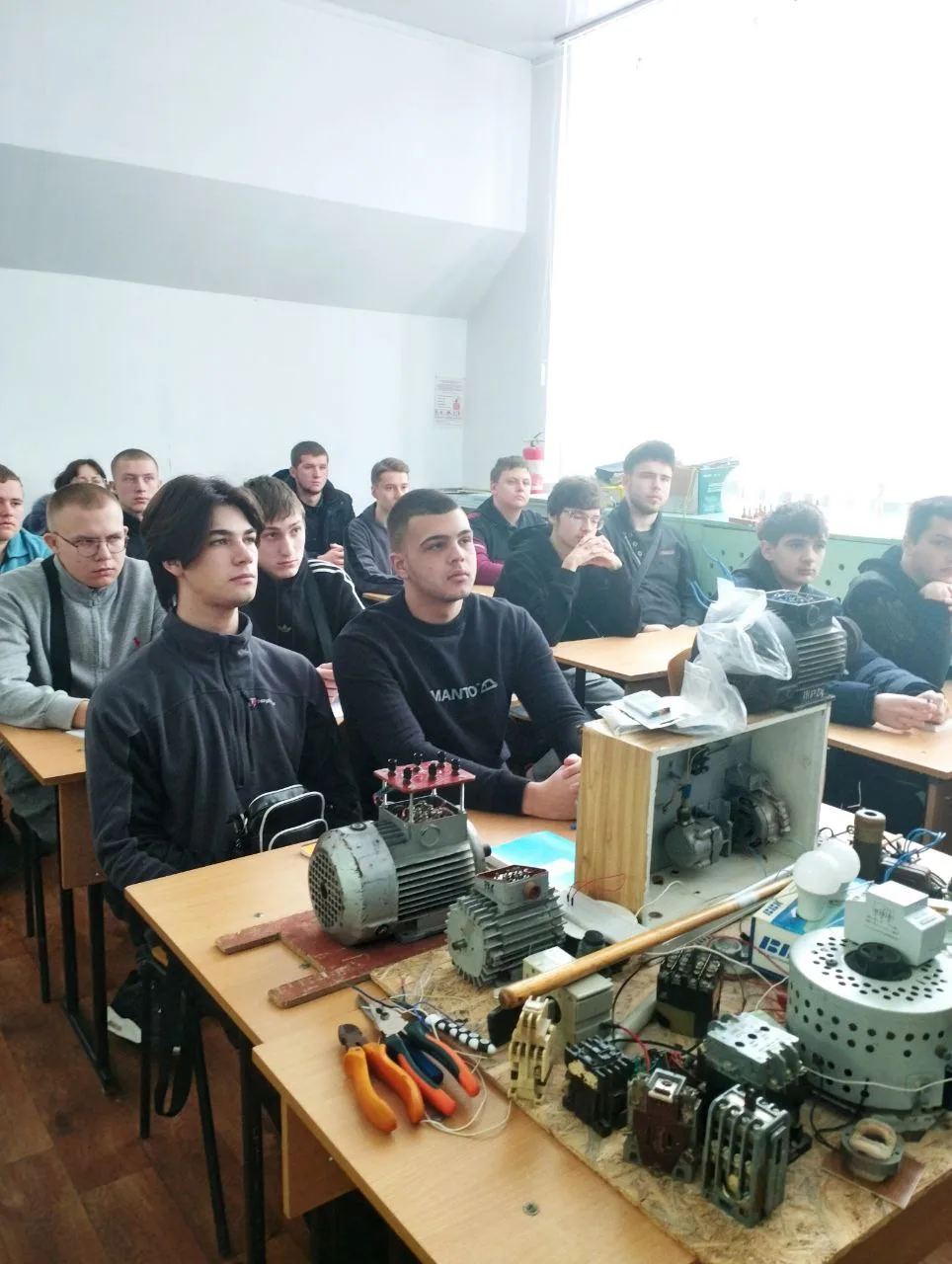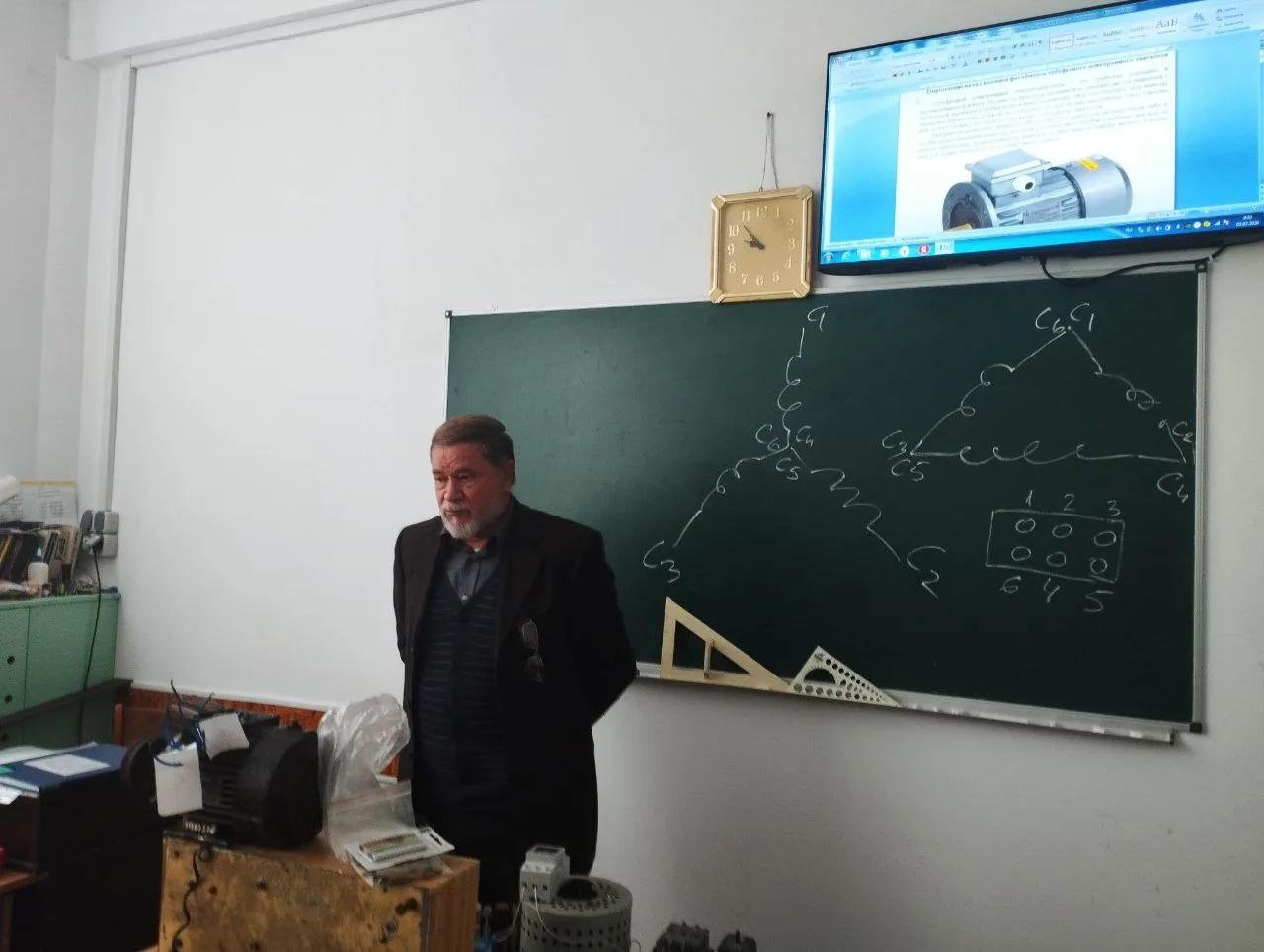 Во время урока были рассмотрены три способа нахождения начала и конца обмоток статора трехфазного асинхронного двигателя. Преподаватель продемонстрировал наглядные материалы и схемы, которые помогли студентам лучше понять тему.