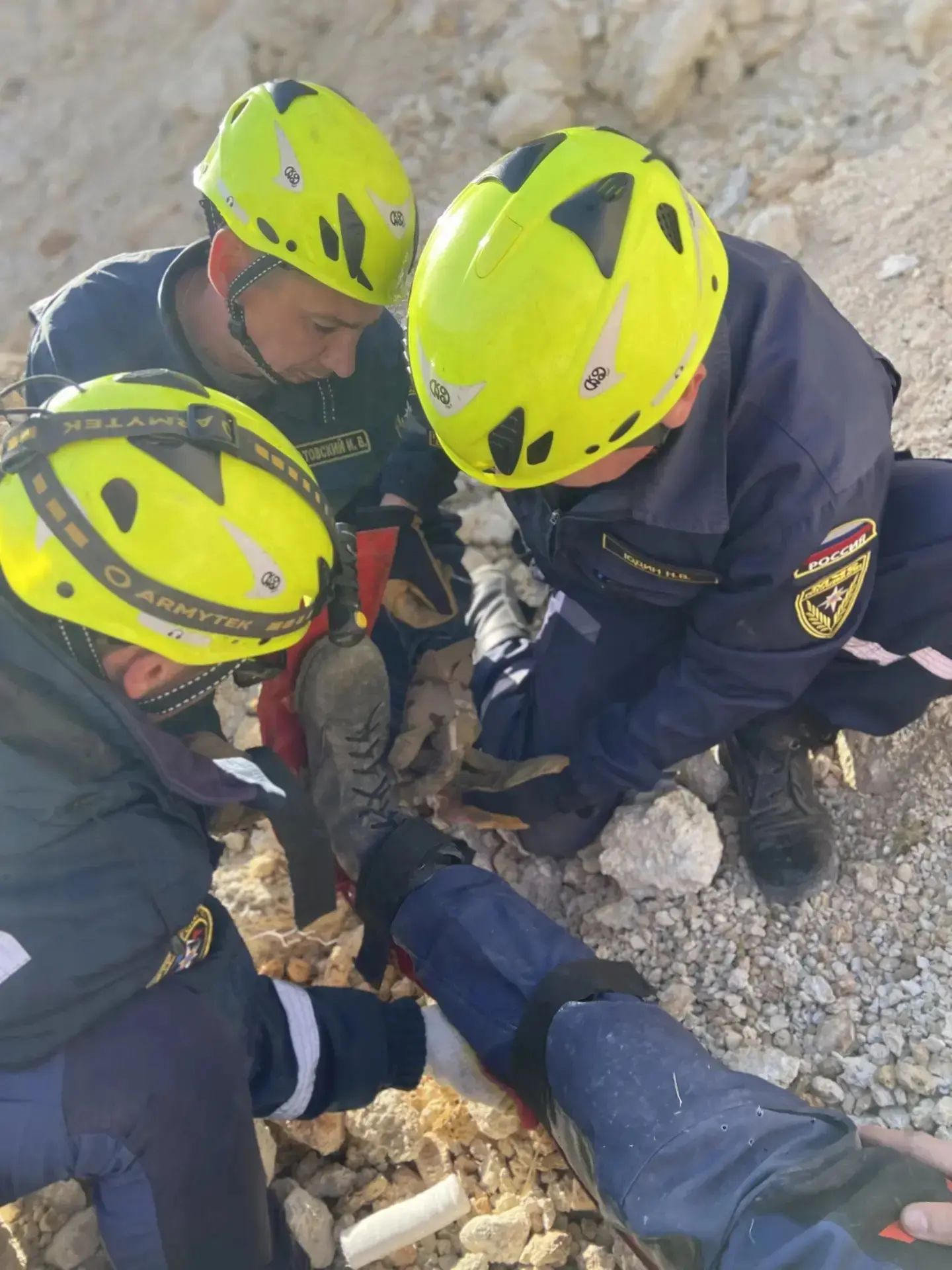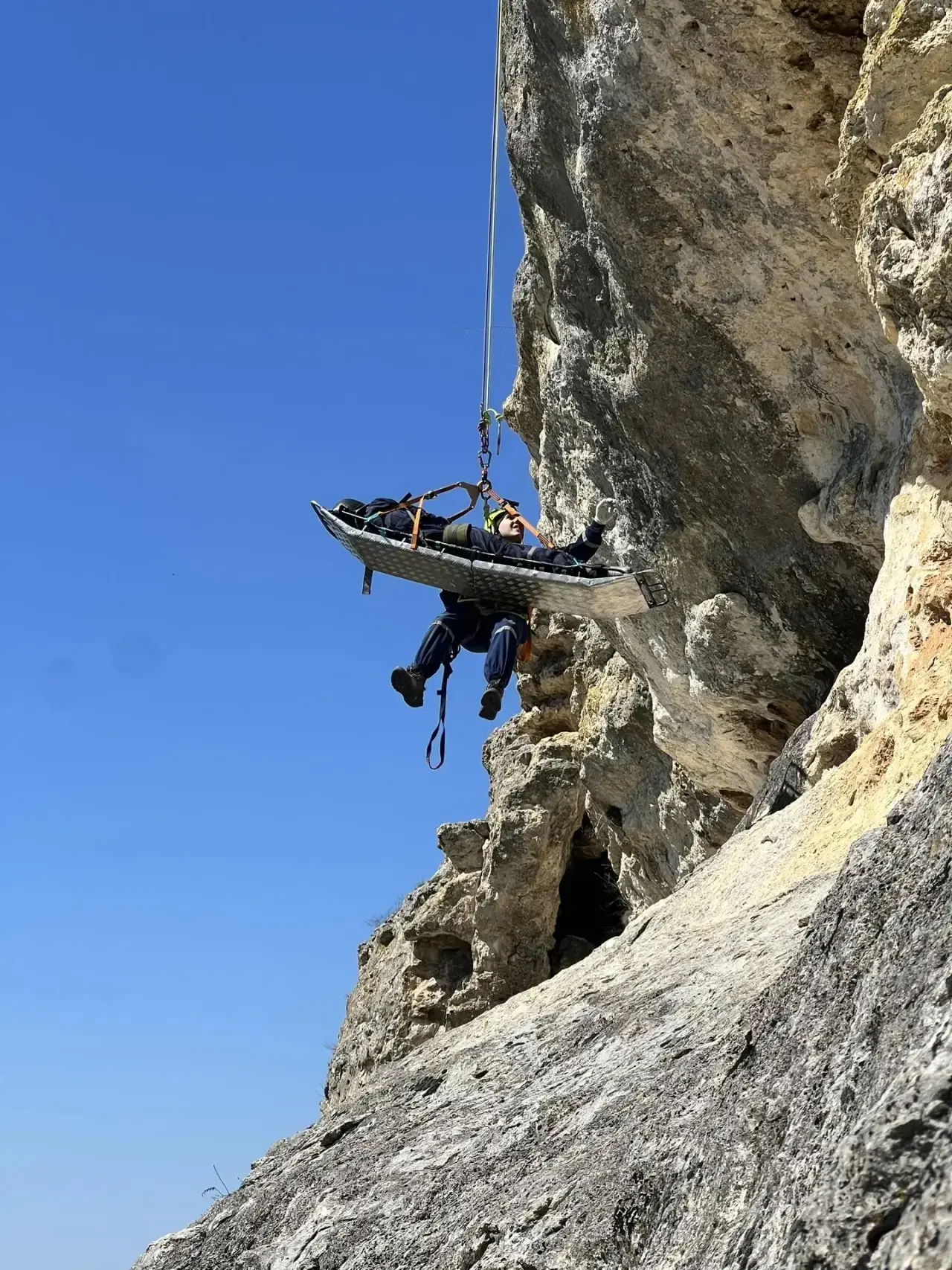 🔻Прибыв к месту вызова, спасатели спустились к пострадавшему и оказали ему первую медицинскую помощь посредством наложения шин на поврежденные конечности, а также воротник Шанца. После этого на спецносилках мужчину транспортировали в карету скорой помощи.