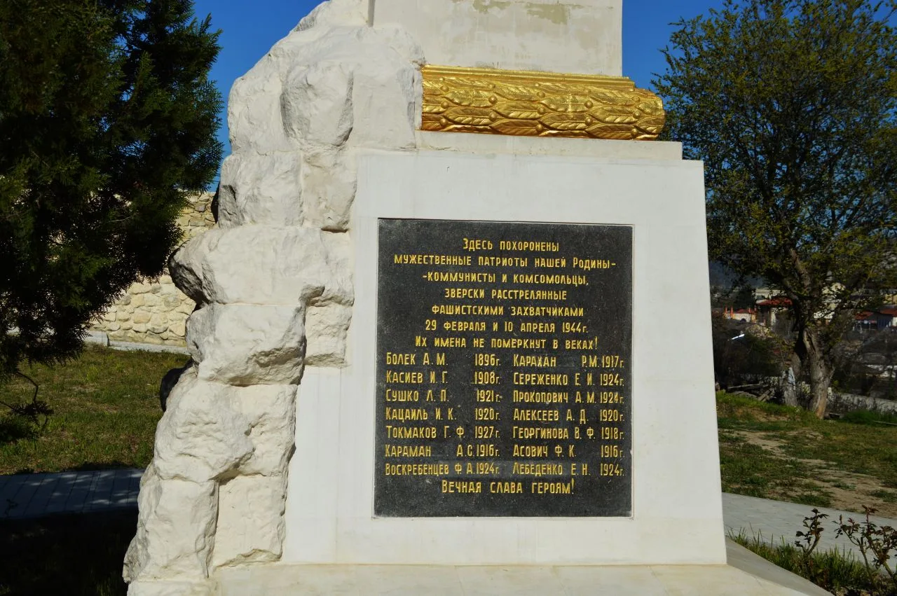 🔸В ней захоронены жители Бахчисарая, которые были расстреляны 10 апреля 1944 года перед самым освобождением города. Среди множества имен – 4 сотрудника пожарной охраны г. Бахчисарая: Болек Абрам Маркович, Сушко Леонид Петрович, Токмаков Георгий Федорович, Кацаиль Илья Константинович.