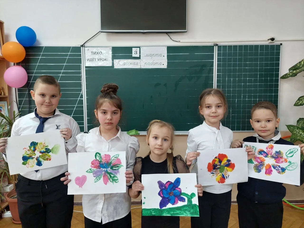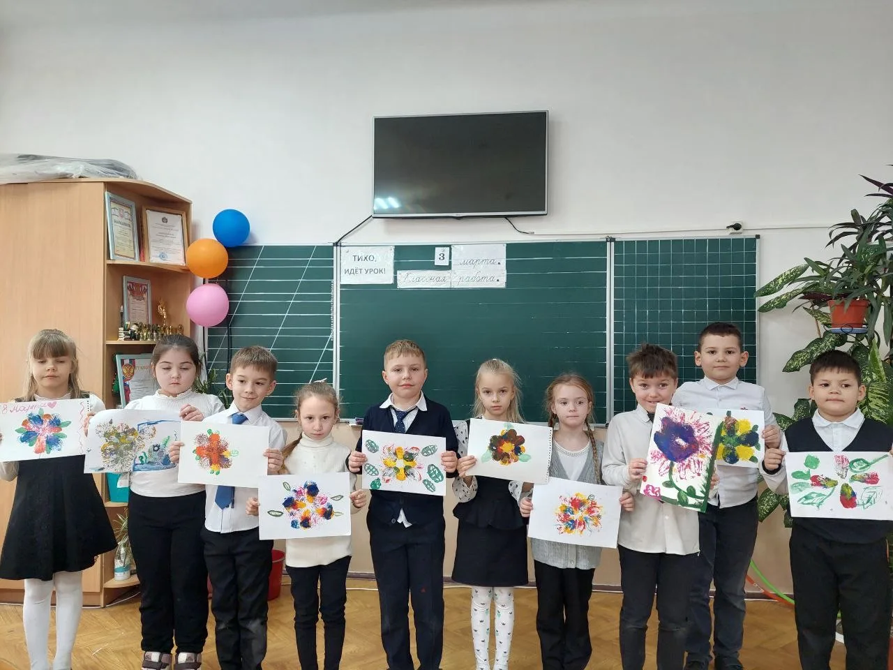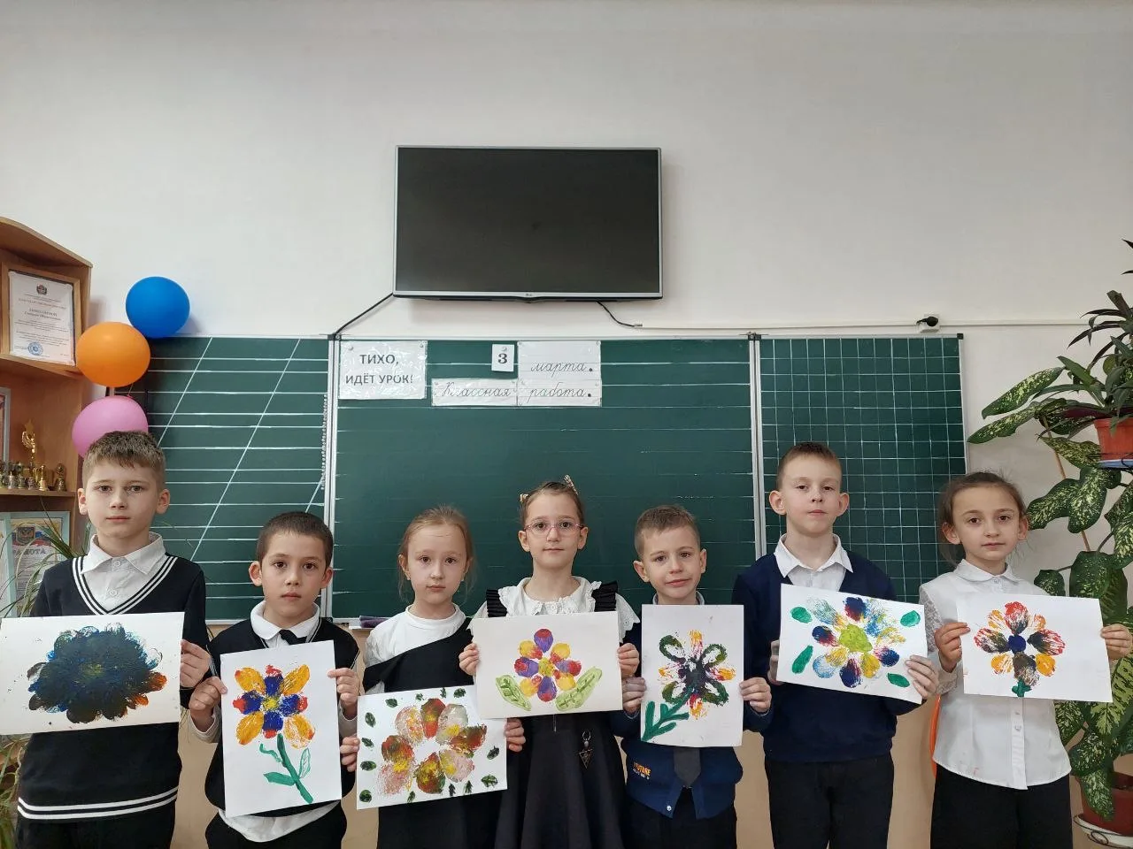 По руководством Елены Владимировны первоклассники овладели необычной техникой рисования. С помощью цветных оттисков пенопластовых форм, сделанных своими руками, первоклассникам удалось создать на бумаге неповторимые по красоте цветы.