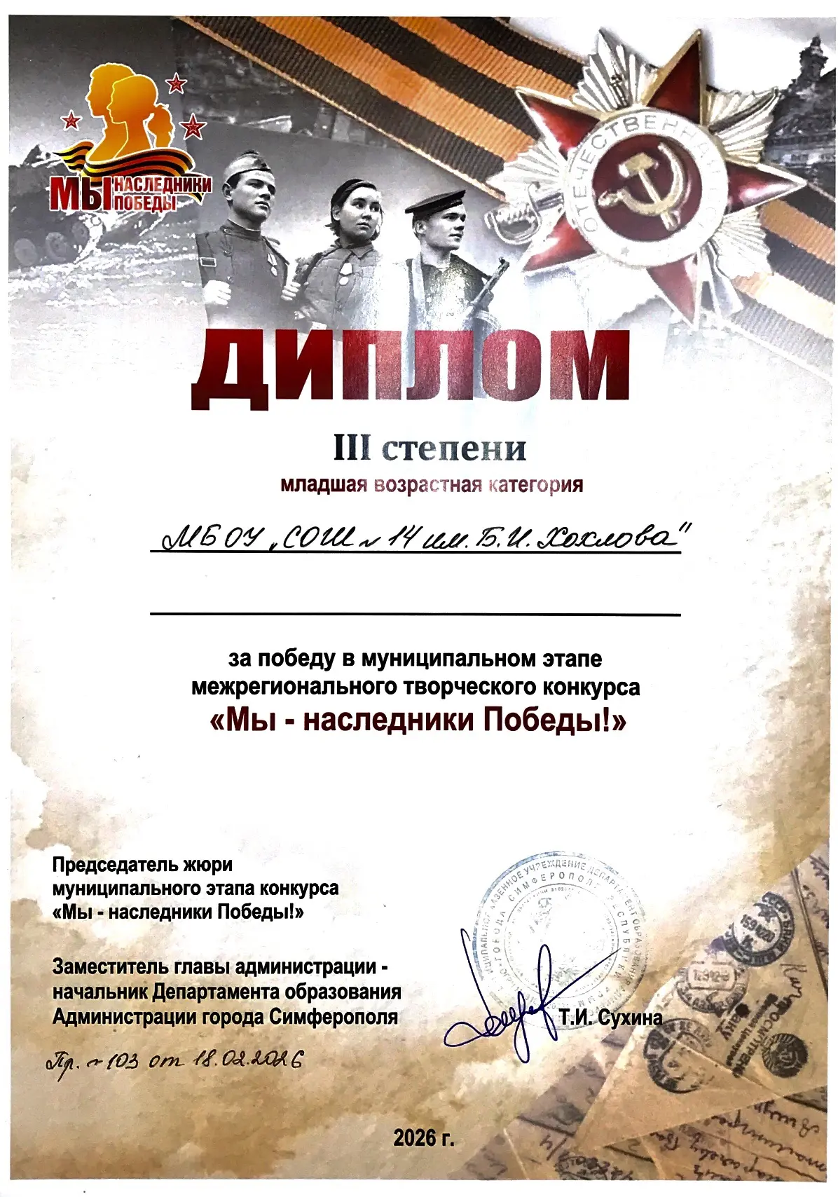 Участники театрального кружка «Подмостки» МБОУ «СОШ №14 им. Б. И. Хохлова» г. Симферополя вошли в число победителей муниципального этапа межрегионального творческого конкурса "Мы-наследники Победы!" и заняли почетное III место!