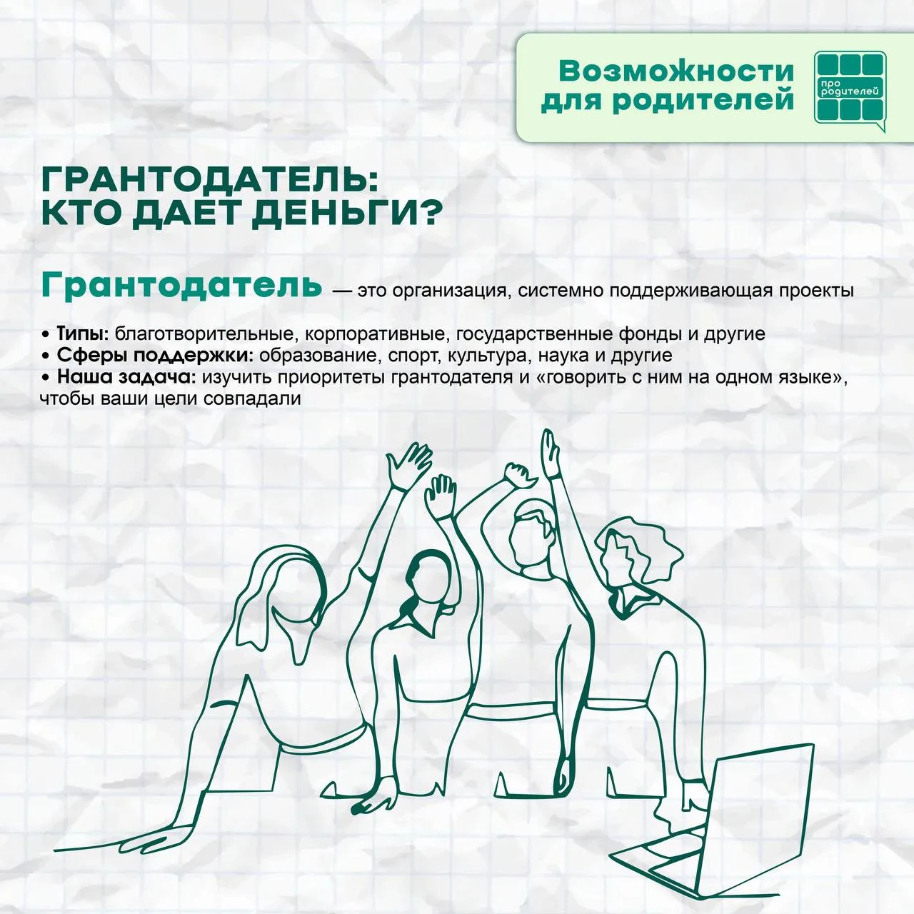 Дорогие родители! Задумывались ли вы о реализации интересной идеи, которая могла бы принести пользу вашим детям, семье или даже всему сообществу? Возможно, это новый кружок для развития талантов, организация спортивного праздника или создание полезного онлайн-ресурса. Многие из этих идей требуют финансовой поддержки, и тогда на помощь приходят гранты!