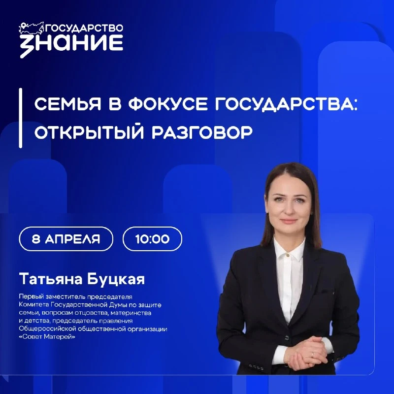 8 апреля в 10:00 (мск) в рамках проекта Знание.Государство состоится трансляция на тему «Семья в фокусе государства: открытый разговор».