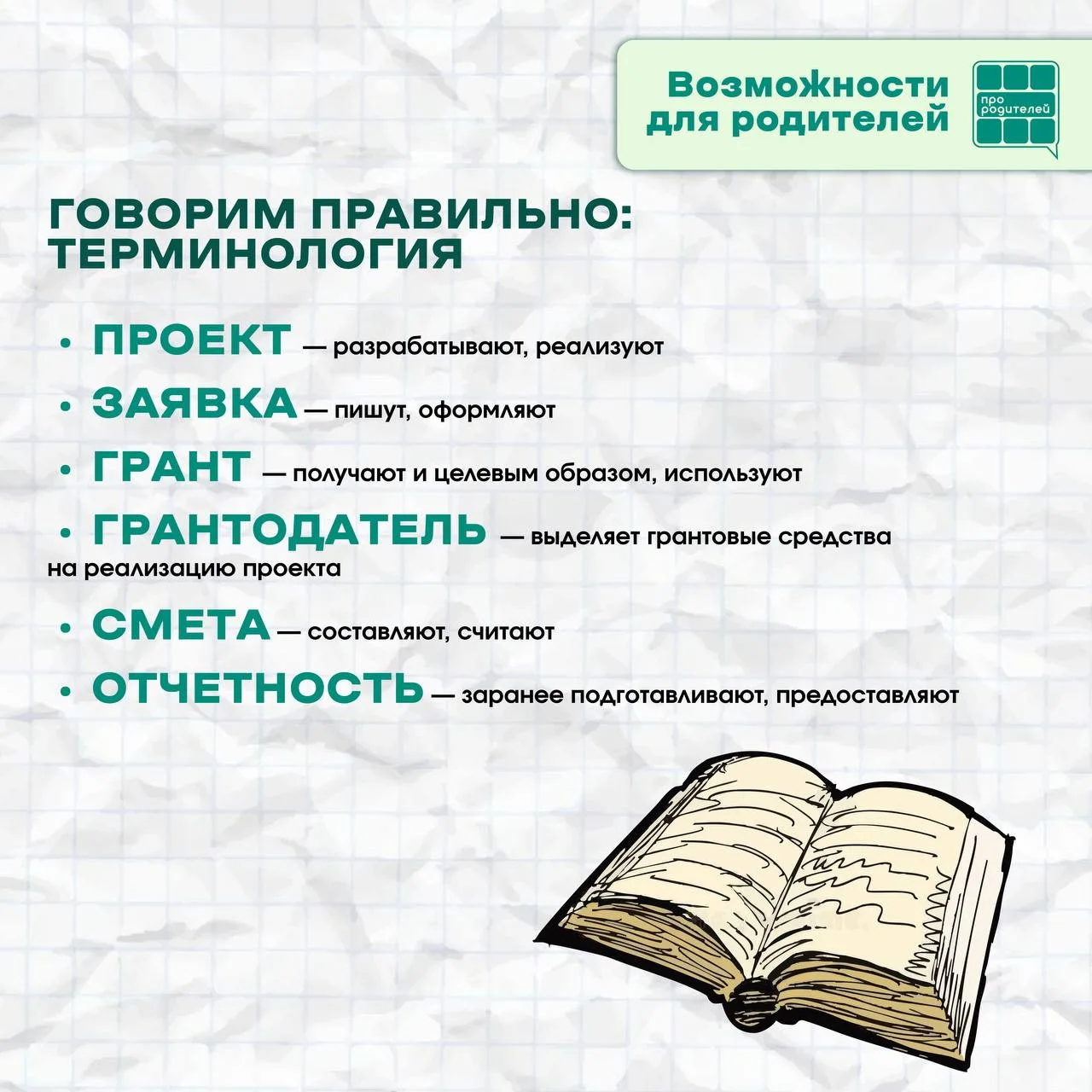 Чтобы вам было проще разобраться, наша команда подготовила специальные карточки! В них мы простым и понятным языком рассказали о ключевых понятиях, связанных с получением гранта: