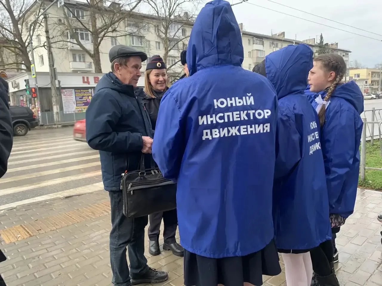 Юные инспекторы движения активно участвовали в рейде, раздавая листовки и памятки о соблюдении правил дорожного движения при пересечении проезжей части.