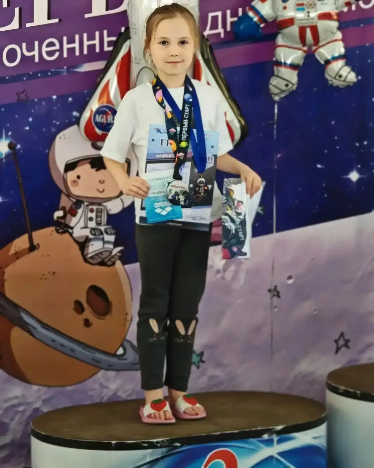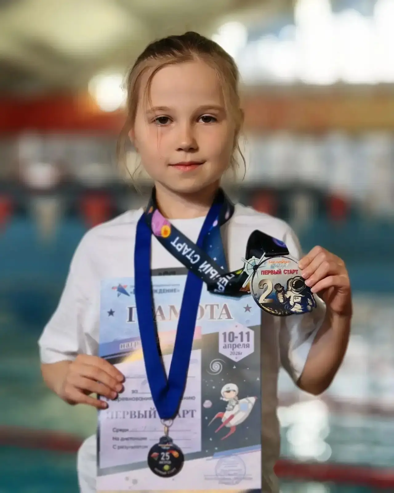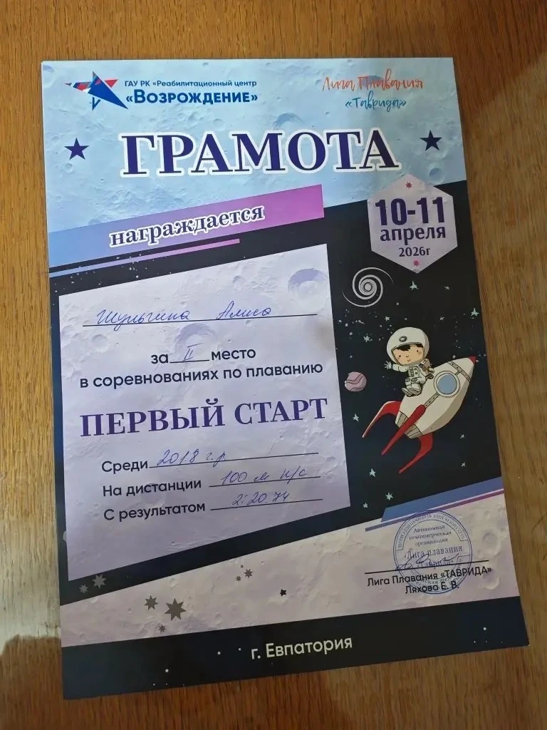 Шульгина Алиса, ученица 1-А класса приняла участие в соревнованиях по плаванию «Первый старт» приуроченных ко Дню Космонавтики, которые прошли в г. Евпатория.