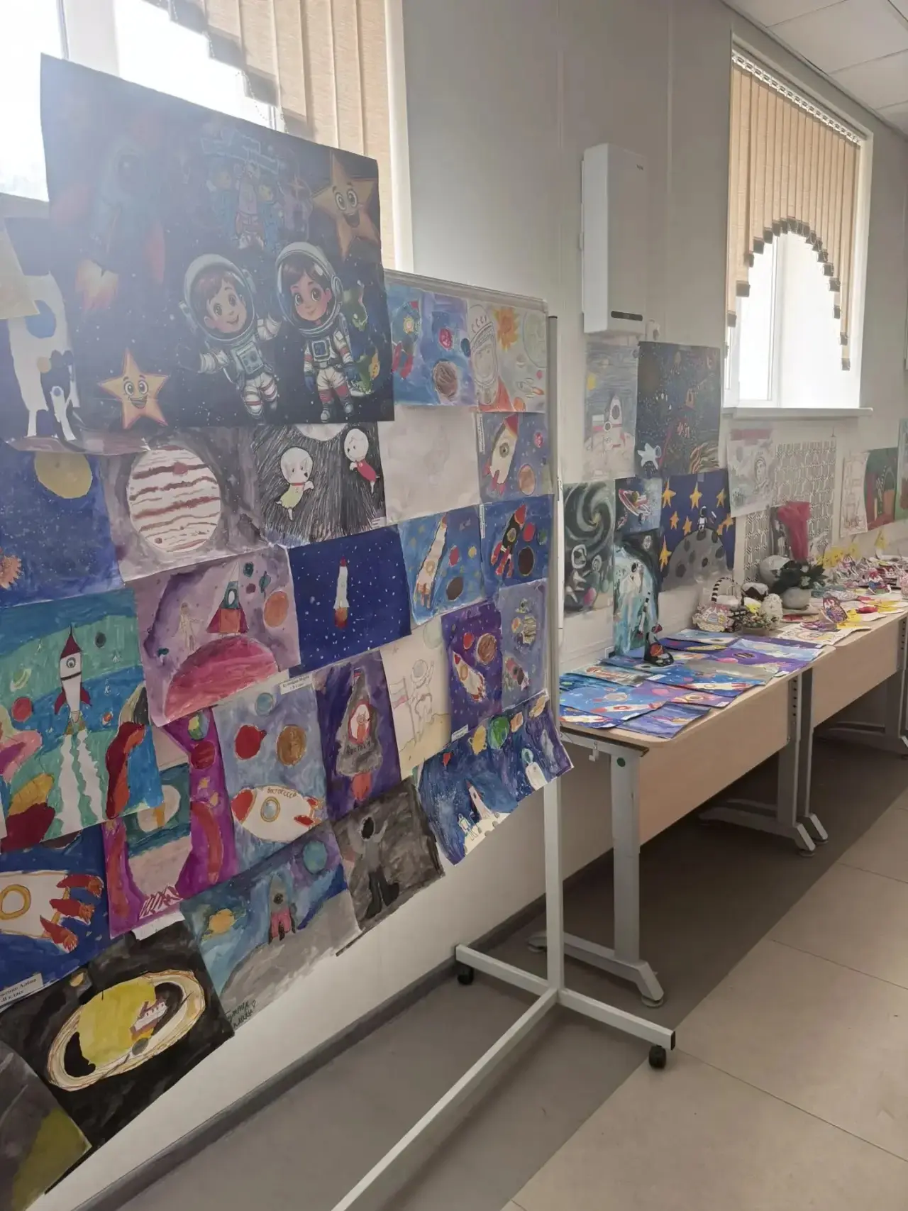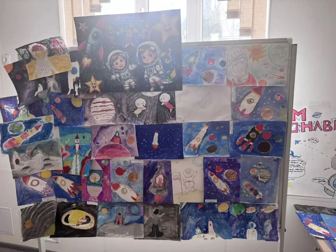 Ребята начальной и средней школы подошли к теме творчески: яркие плакаты, красочные рисунки, ракеты, звёзды и бескрайний космос глазами детей — всё это теперь можно увидеть в холле .