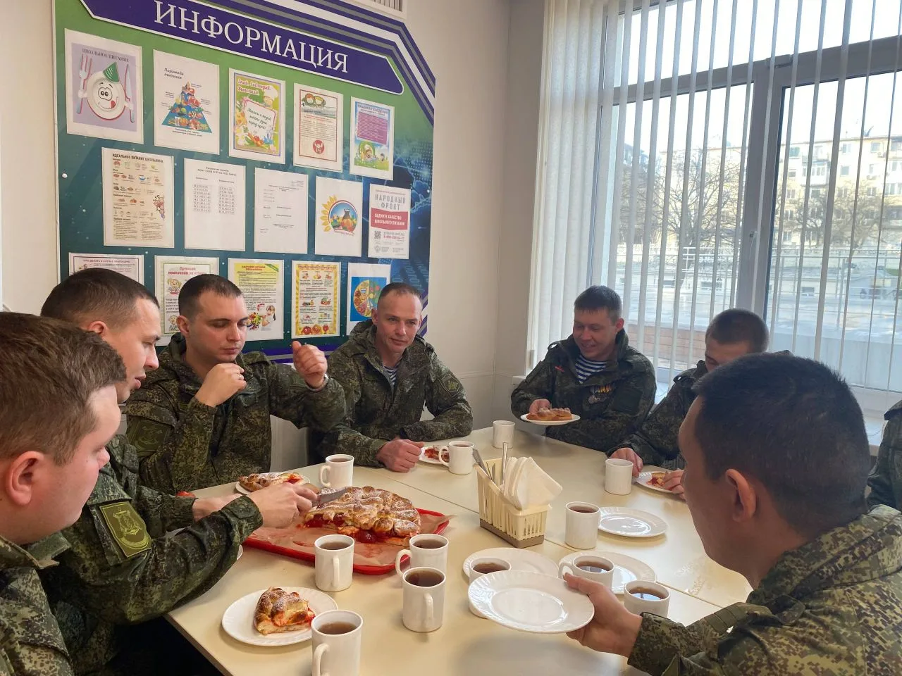 Нашим дорогим гостям были преданы подарки, ручные грелки для бойцов и письма от ребят. Так же было организовано чаепитие со сладким пирогом, который приготовили с любовью наши повара.