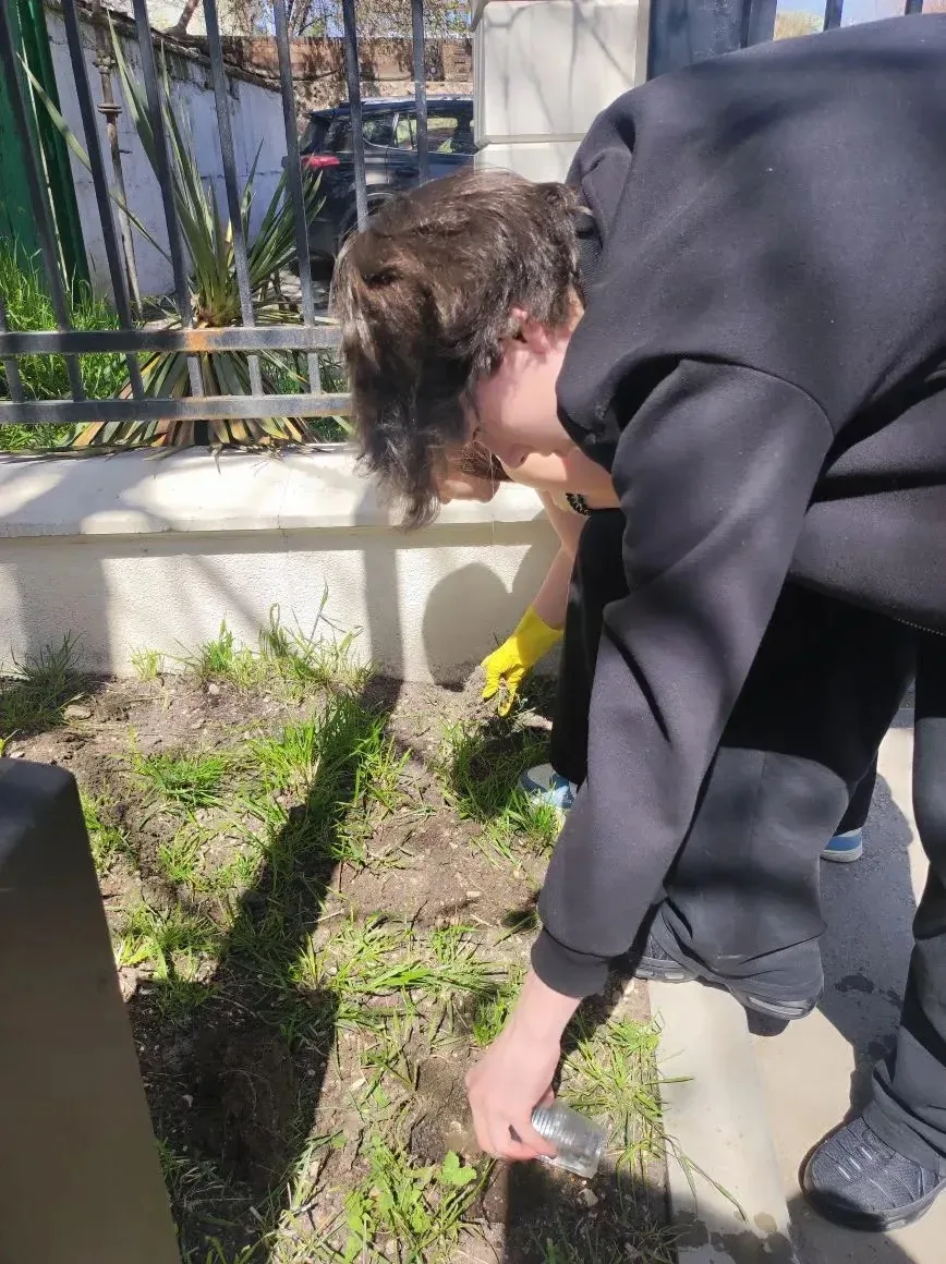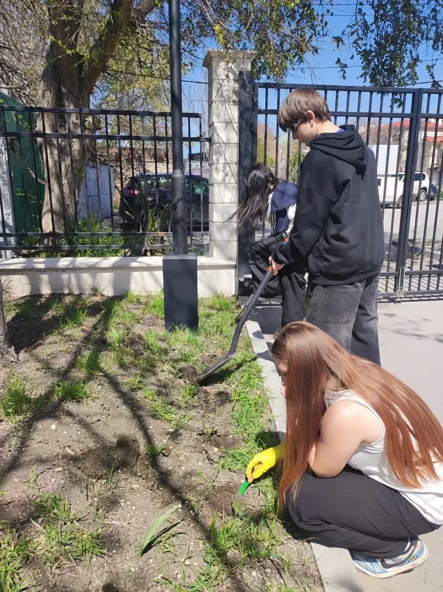 Ученики 8-Б класса активно участвуют в благоустройстве и озеленении территории школы.