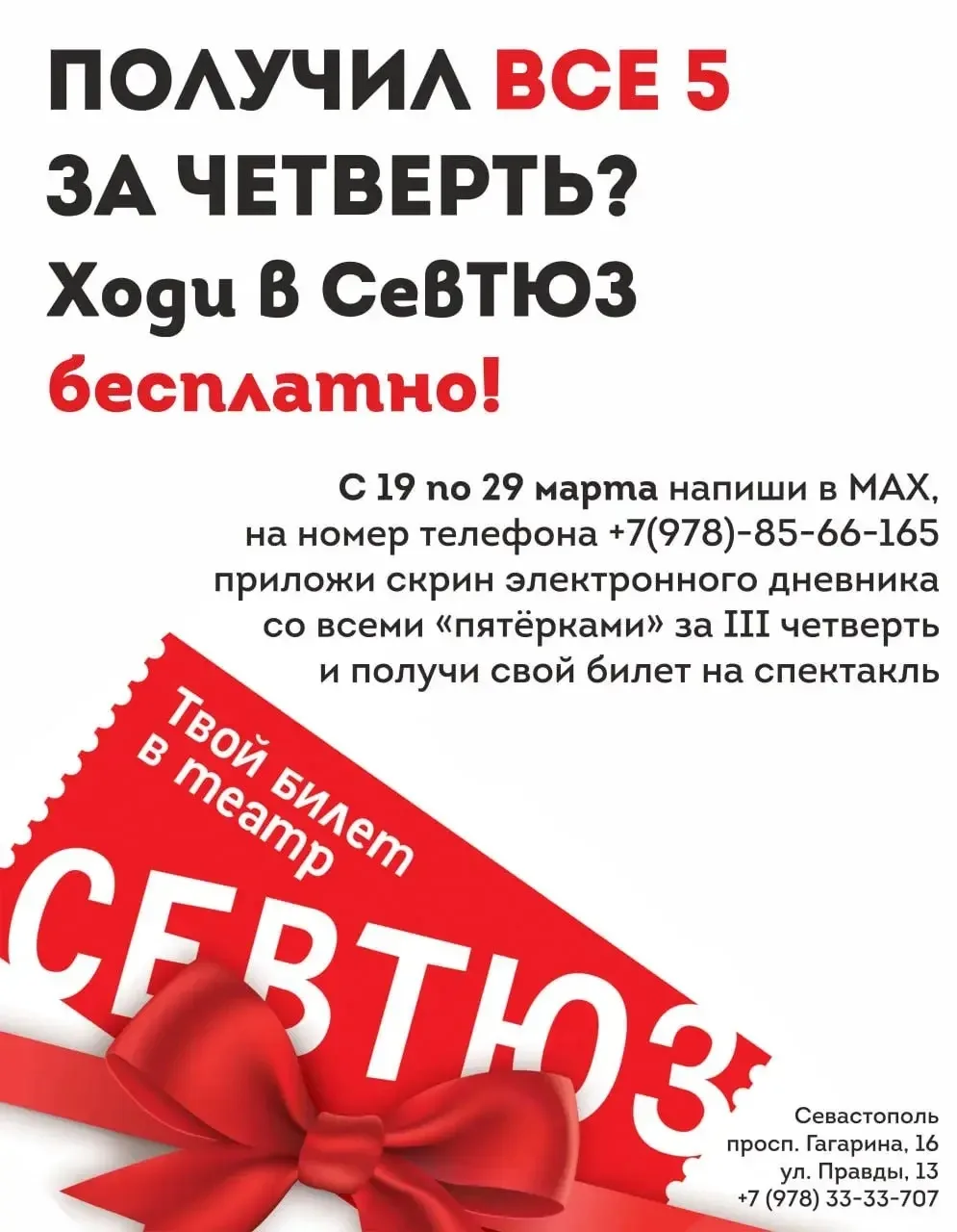 В период с 19 по 29 марта направьте сообщение в мессенджер MAX на номер +7 (978) 85-66-165, приложив скриншот электронного дневника, подтверждающий успеваемость. После проверки данных участнику будет предоставлен электронный билет на один из спектаклей репертуара.
