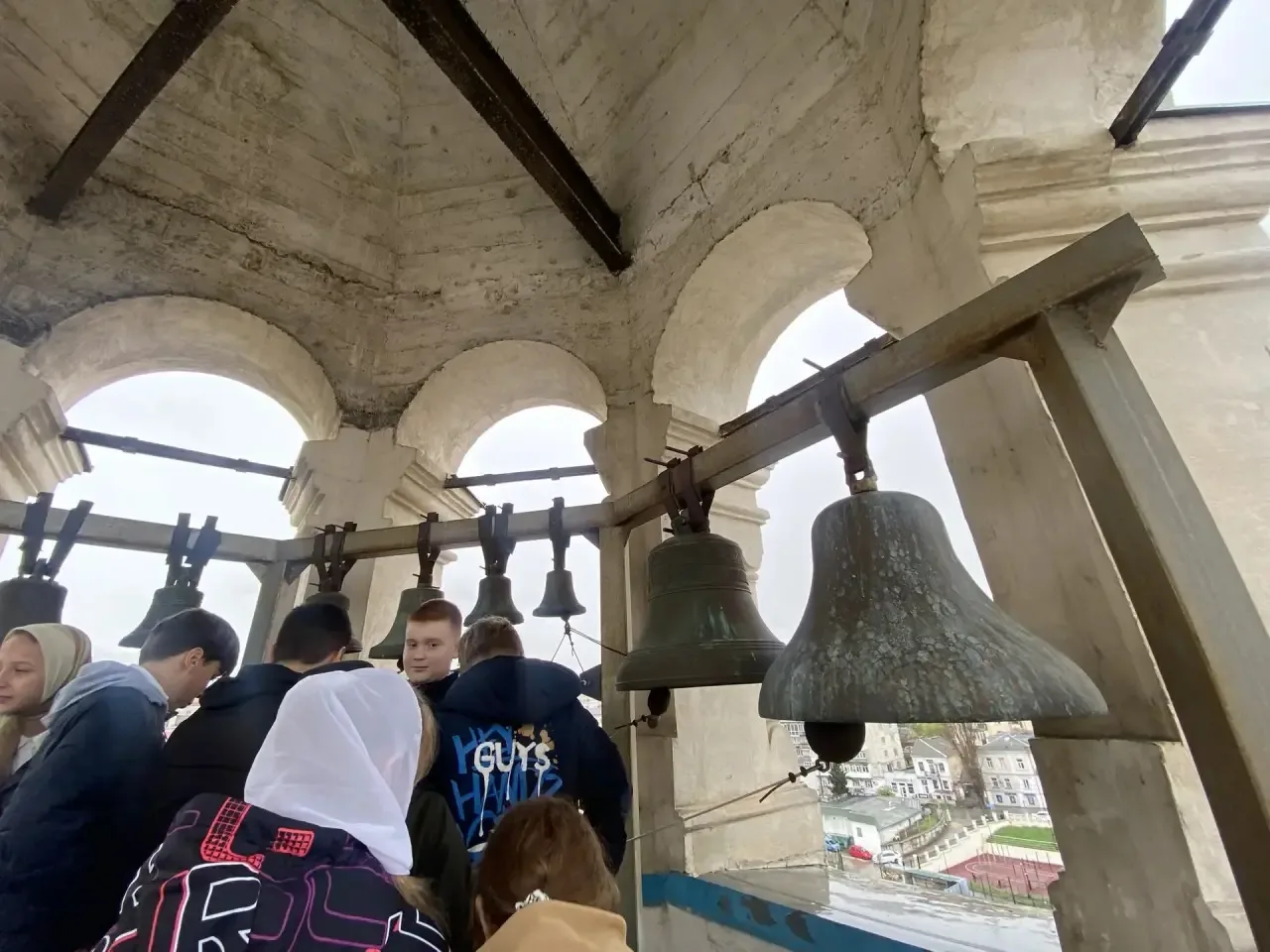 Дети поднялись на колокольню и пробовали сами звонить.