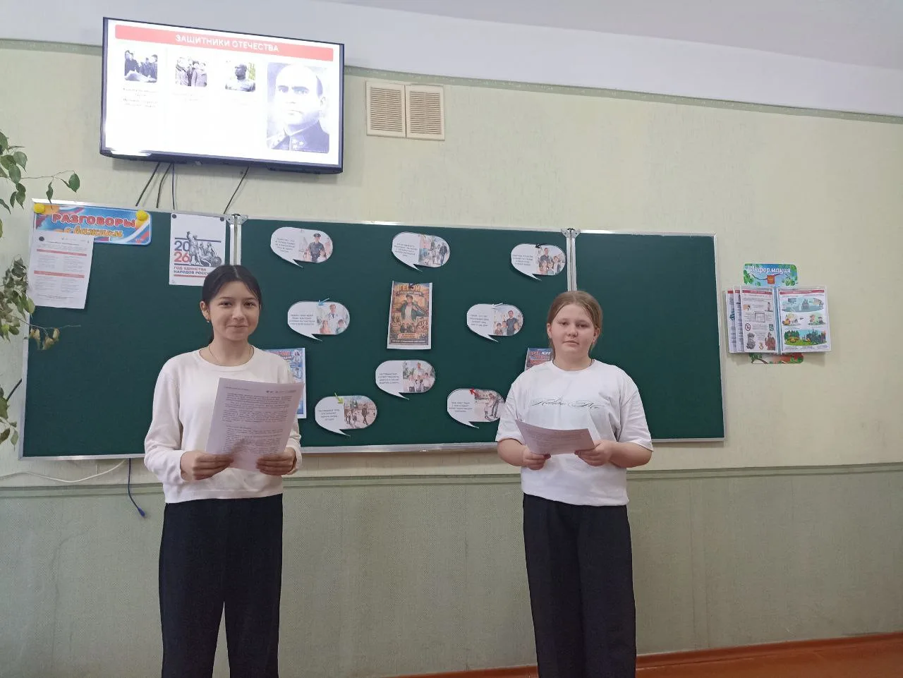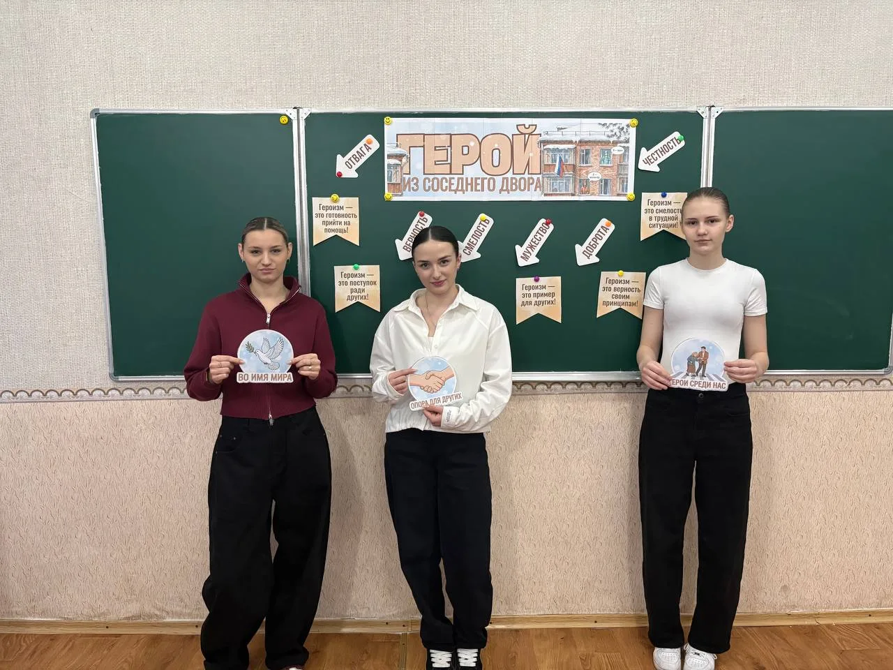 Особое внимание было уделено примерам из разных регионов страны: рассказы о военнослужащих, оперативных действиях спасателей, героических поступках медиков и волонтёров, а также историям простых людей, которые в трудный момент не остались в стороне. Учащиеся делились реальными примерами из семьи и соседства, обсуждали, как в повседневной жизни можно поддерживать и защищать окружающих.