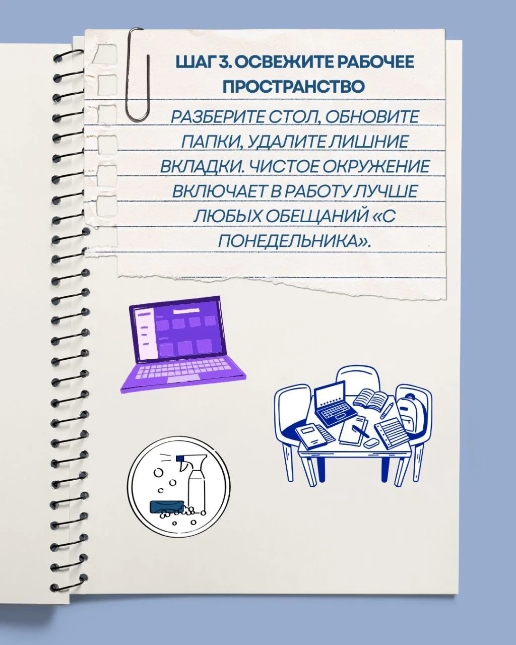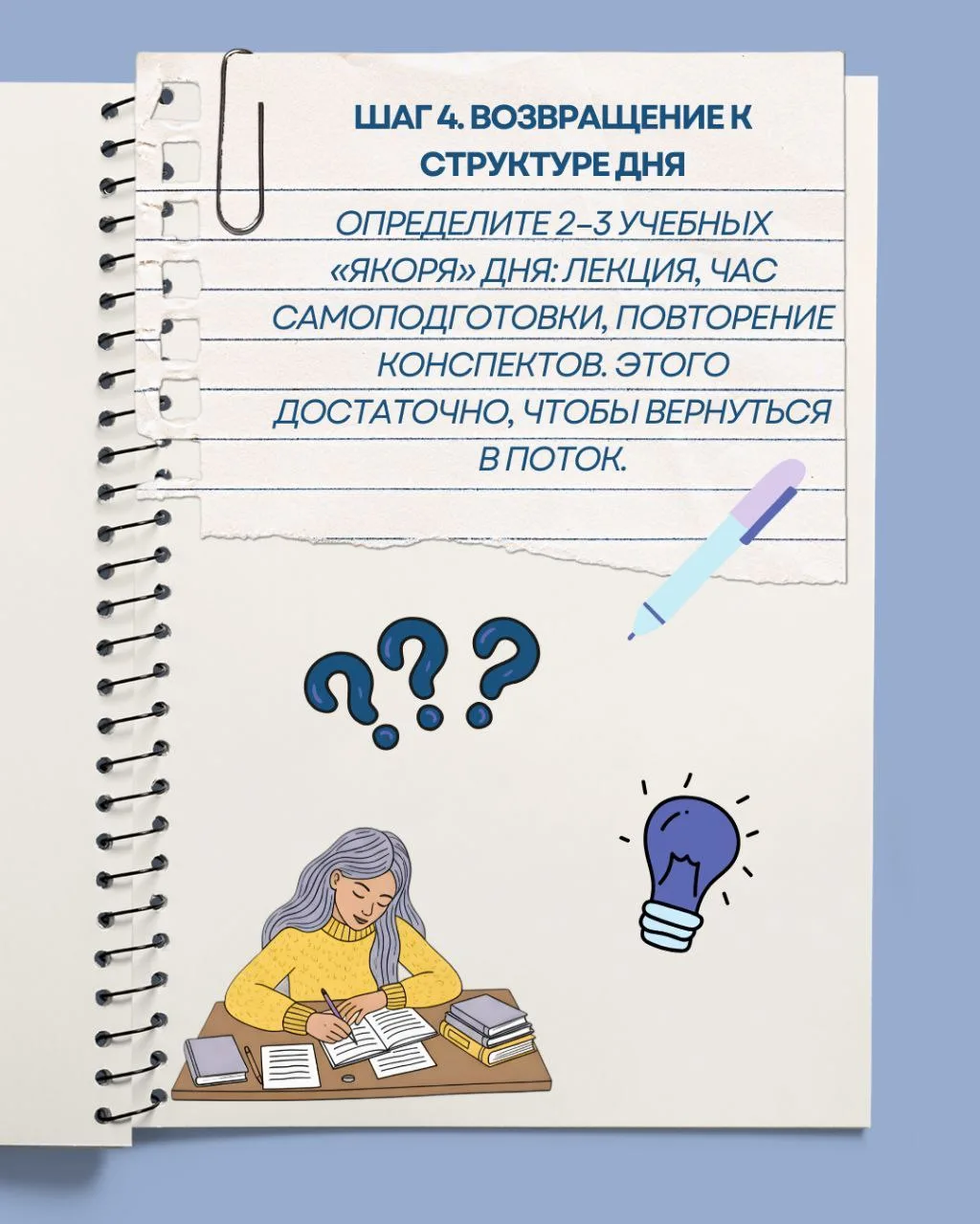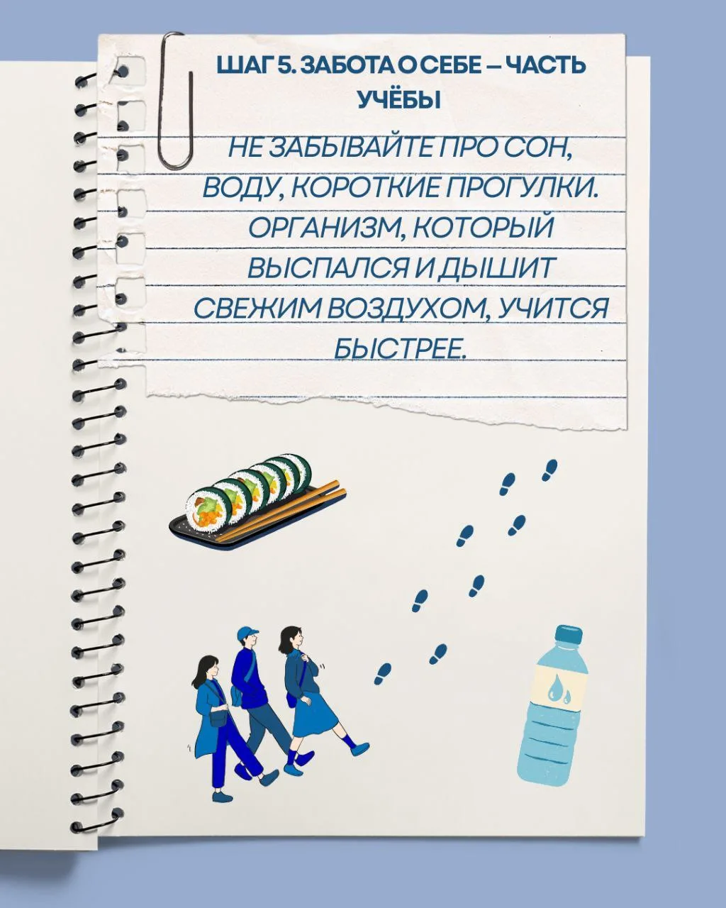 Мы подготовили карточки с информацией, которая мягко введёт вас обратно в учебный ритм. Воспользуйтесь нашими полезными советами, чтобы вернуться в университет энергичными, с полным зарядом сил и хорошего настроения. 🩵